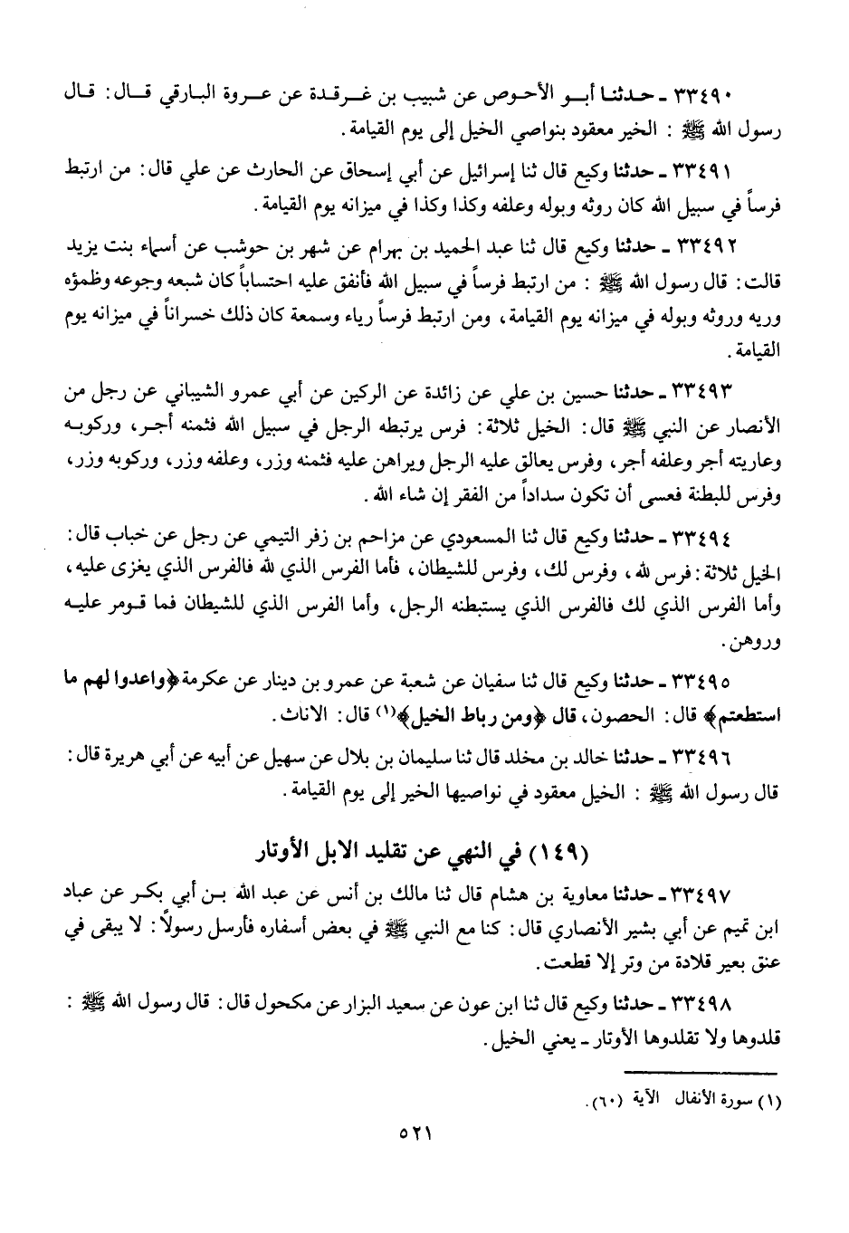 33490 - حَدَّثَنَا أَبُو الْأَحْوَصِ، عَنْ شَبِيبِ بْنِ غَرْقَدَةَ، عَنْ عُرْوَةَ الْبَارِقِيِّ قَالَ: قَالَ رَسُولُ اللَّهِ صَلَّى اللهُ عَلَيْهِ وَسَلَّمَ: «§الْخَيْرُ مَعْقُودٌ بِنَوَاصِي الْخَيْلِ إِلَى يَوْمِ الْقِيَامَةِ»