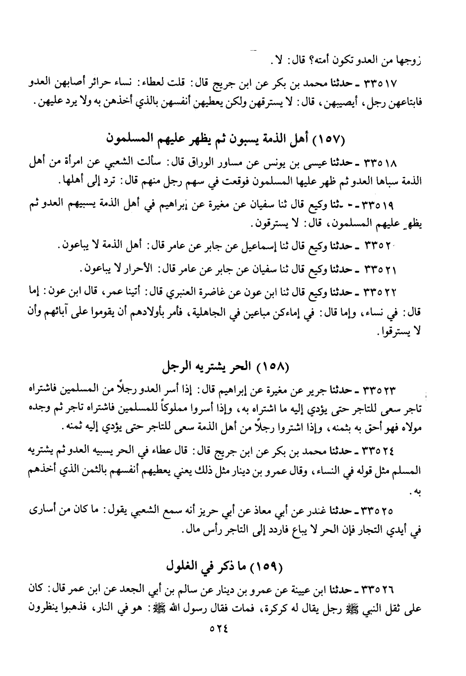 33517 - حَدَّثَنَا مُحَمَّدُ بْنُ بَكْرٍ، عَنِ ابْنِ جُرَيْجٍ قَالَ: قُلْتُ لِعَطَاءٍ: نِسَاءٌ حَرَائِرُ أَصَابَهُنَّ الْعَدُوُّ فَابْتَاعَهُنَّ رَجُلٌ، أَيُصِيبُهُنَّ قَالَ: «§لَا وَلَا يَسْتَرِقُّهُنَّ وَلَكِنْ يُعْطِيهِنَّ أَنْفُسَهُنَّ بِالَّذِي أَخَذَهُنَّ بِهِ وَلَا يُرَدُّ عَلَيْهِنَّ»