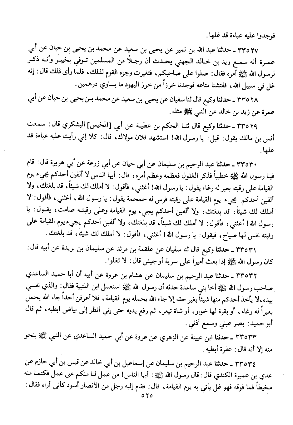33530 - حَدَّثَنَا عَبْدُ الرَّحِيمِ بْنُ سُلَيْمَانَ، عَنْ أَبِي حَيَّانَ، عَنْ أَبِي زُرْعَةَ، عَنْ أَبِي هُرَيْرَةَ قَالَ: قَامَ فِينَا رَسُولُ اللَّهِ صَلَّى اللهُ عَلَيْهِ وَسَلَّمَ خَطِيبًا فَذَكَرَ الْغُلُولَ فَعَظَّمَهُ وَعَظَّمَ أَمْرَهُ ثُمَّ قَالَ: " §أَيُّهَا النَّاسُ لَا أُلْفِيَنَّ أَحَدَكُمْ يَجِيءُ يَوْمَ الْقِيَامَةِ عَلَى رَقَبَتِهِ بَعِيرٌ لَهُ رُغَاءٌ يَقُولُ: يَا رَسُولَ اللَّهِ أَغِثْنِي فَأَقُولُ: لَا أَمْلِكُ لَكَ شَيْئًا، قَدْ بَلَّغْتُكَ، وَلَا أُلْفِيَنَّ أَحَدَكُمْ يَجِيءُ يَوْمَ الْقِيَامَةِ عَلَى رَقَبَتِهِ فَرَسٌ لَهُ حَمْحَمَةٌ يَقُولُ: يَا رَسُولَ اللَّهِ أَغِثْنِي فَأَقُولُ: لَا أَمْلِكُ لَكَ شَيْئًا، قَدْ بَلَّغْتُكَ، وَلَا أُلْفِيَنَّ أَحَدَكُمْ يَجِيءُ يَوْمَ الْقِيَامَةِ وَعَلَى رَقَبَتِهِ صَامِتٌ يَقُولُ: يَا رَسُولَ اللَّهِ أَغِثْنِي فَأَقُولُ: لَا أَمْلِكُ لَكَ شَيْئًا، قَدْ بَلَّغْتُكَ، وَلَا أُلْفِيَنَّ أَحَدَكُمْ يَجِيءُ يَوْمَ الْقِيَامَةِ عَلَى رَقَبَتِهِ نَفْسٌ لَهَا صِيَاحٌ، فَيَقُولُ: يَا رَسُولَ اللَّهِ أَغِثْنِي فَأَقُولُ: لَا أَمْلِكُ لَكَ شَيْئًا، قَدْ بَلَّغْتُكَ "
