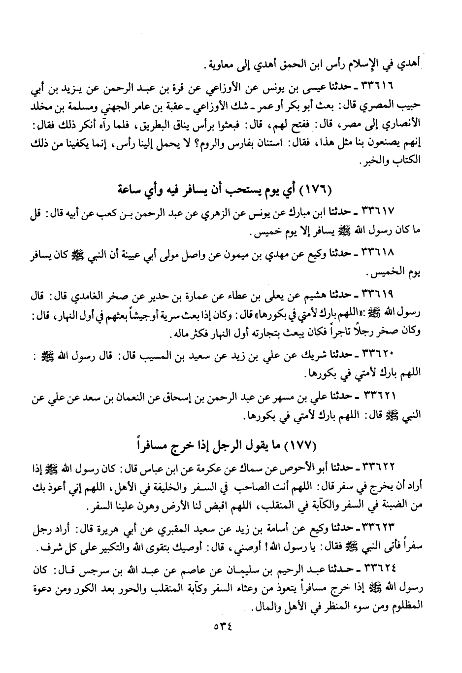 33618 - حَدَّثَنَا وَكِيعٌ، عَنْ مَهْدِيِّ بْنِ مَيْمُونٍ، عَنْ وَاصِلٍ، مَوْلَى أَبِي عُيَيْنَةَ أَنَّ النَّبِيَّ صَلَّى اللهُ عَلَيْهِ وَسَلَّمَ كَانَ §يُسَافِرُ يَوْمَ الْخَمِيسِ "