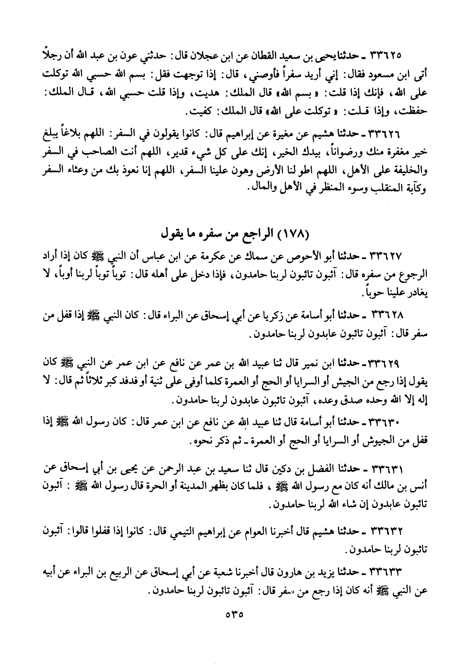 33633 - حَدَّثَنَا يَزِيدُ بْنُ هَارُونَ، قَالَ أَخْبَرَنَا شُعْبَةُ، عَنْ أَبِي إِسْحَاقَ، عَنِ الرَّبِيعِ بْنِ الْبَرَاءِ، عَنْ أَبِيهِ، عَنِ النَّبِيِّ صَلَّى اللهُ عَلَيْهِ وَسَلَّمَ أَنَّهُ كَانَ §إِذَا رَجَعَ مِنْ سَفَرِهِ قَالَ: آيِبُونَ تَائِبُونَ لِرَبِّنَا حَامِدُونَ "