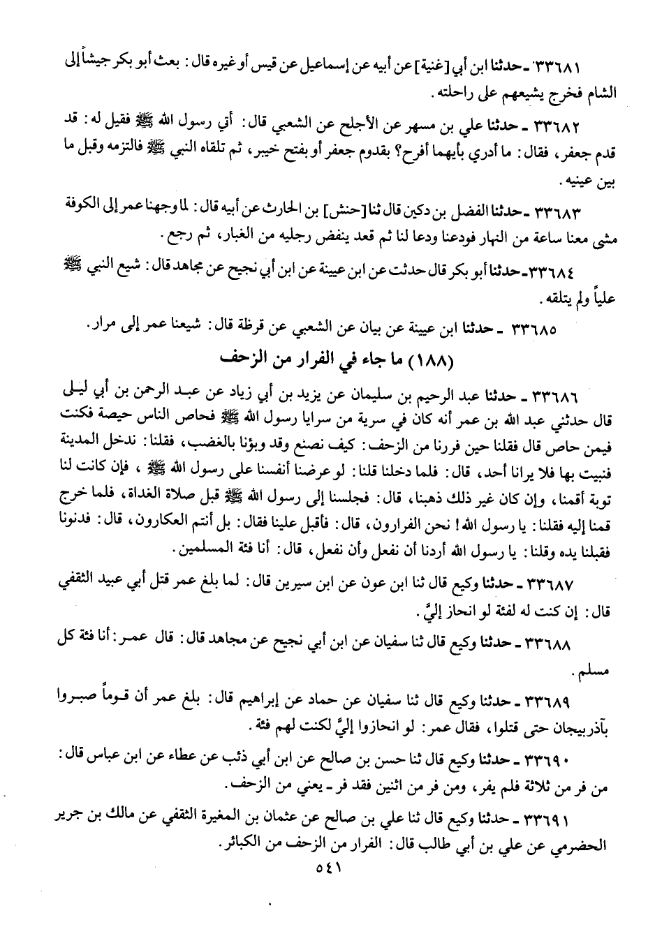 33686 - حَدَّثَنَا عَبْدُ الرَّحِيمِ بْنُ سُلَيْمَانَ، عَنْ يَزِيدَ بْنِ أَبِي زِيَادٍ، عَنْ عَبْدِ الرَّحْمَنِ بْنِ أَبِي لَيْلَى، قَالَ حَدَّثَنِي عَبْدُ اللَّهِ بْنُ عُمَرَ، أَنَّهُ كَانَ فِي سَرِيَّةٍ مِنْ سَرَايَا رَسُولِ اللَّهِ صَلَّى اللهُ عَلَيْهِ وَسَلَّمَ §فَحَاصَ النَّاسُ حَيْصَةً فَكُنْتُ فِيمَنْ حَاصَ قَالَ فَقُلْنَا حِينَ فَرَرْنَا مِنَ الزَّحْفِ: كَيْفَ نَصْنَعُ وَقَدْ فَرَرْنَا مِنَ الزَّحْفِ وَبُؤْنَا بِالْغَضَبِ , فَقُلْنَا: نَدْخُلُ الْمَدِينَةَ فَنَبِيتُ بِهَا فَلَا يَرَانَا أَحَدٌ , قَالَ: فَلَمَّا دَخَلْنَا قُلْنَا: لَوْ عَرَضْنَا أَنْفُسَنَا عَلَى رَسُولِ اللَّهِ صَلَّى اللهُ عَلَيْهِ وَسَلَّمَ , فَإِنْ كَانَتْ لَنَا تَوْبَةٌ أَقَمْنَا , وَإِنْ كَانَ غَيْرَ ذَلِكَ ذَهَبْنَا , قَالَ: فَجَلَسْنَا إِلَى رَسُولِ اللَّهِ صَلَّى اللهُ عَلَيْهِ وَسَلَّمَ قَبْلَ صَلَاةِ الْغَدَاةِ , فَلَمَّا خَرَجَ قُمْنَا إِلَيْهِ فَقُلْنَا: يَا رَسُولَ اللَّهِ , نَحْنُ الْفَرَّارُونَ , قَالَ: فَأَقْبَلَ عَلَيْنَا فَقَالَ: بَلْ أَنْتُمُ الْعَكَّارُونَ , قَالَ: فَدَنَوْنَا فَقَبَّلْنَا يَدَهُ وَقُلْنَا: يَا رَسُولَ اللَّهِ أَرَدْنَا أَنْ نَفْعَلَ وَأَنْ نَفْعَلَ , قَالَ: أَنَا فِئَةُ الْمُسْلِمِينَ.