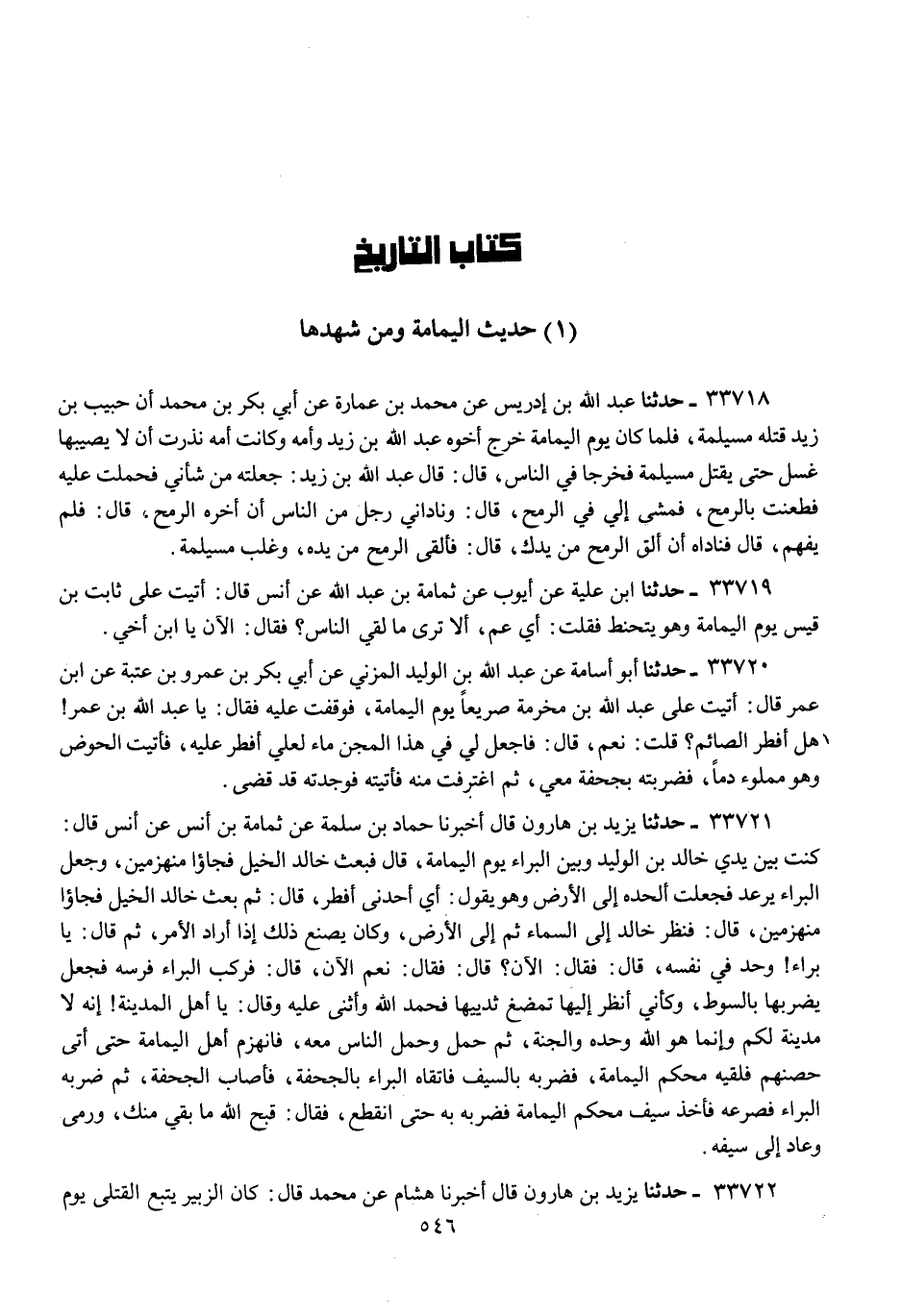 33718 - حَدَّثَنَا عَبْدُ اللَّهِ بْنُ إِدْرِيسَ، عَنْ مُحَمَّدِ بْنِ عُمَارَةَ، عَنْ أَبِي بَكْرِ بْنِ مُحَمَّدٍ، أَنَّ حَبِيبَ بْنَ زَيْدٍ قَتَلَهُ مُسَيْلِمَةُ، فَلَمَّا كَانَ يَوْمُ الْيَمَامَةِ خَرَجَ أَخُوهُ عَبْدُ اللَّهِ بْنُ زَيْدٍ وَأُمُّهُ، وَكَانَتْ أُمُّهُ نَذَرَتْ إِنْ لَا يُصِيبَهَا غُسْلٌ حَتَّى يُقْتَلَ مُسَيْلِمَةُ، فَخَرَجَا فِي النَّاسِ، قَالَ: قَالَ عَبْدُ اللَّهِ بْنُ زَيْدٍ: «جَعَلْتُهُ مِنْ شَأْنِي، §فَحَمَلْتُ عَلَيْهِ، فَطَعَنْتُ بِالرُّمْحِ، فَمَشَى إِلَيَّ فِي الرُّمْحِ» قَالَ: «وَنَادَانِي رَجُلٌ مِنَ النَّاسِ أَنْ أَخِّرِ الرُّمْحَ» قَالَ: فَلَمْ يَفْهَمْ، قَالَ: فَنَادَاهُ أَنْ أَلْقِ الرُّمْحَ مِنْ يَدِكَ، قَالَ: فَأَلْقَى الرُّمْحَ مِنْ يَدِهِ، وَغَلَبَ مُسَيْلِمَةَ