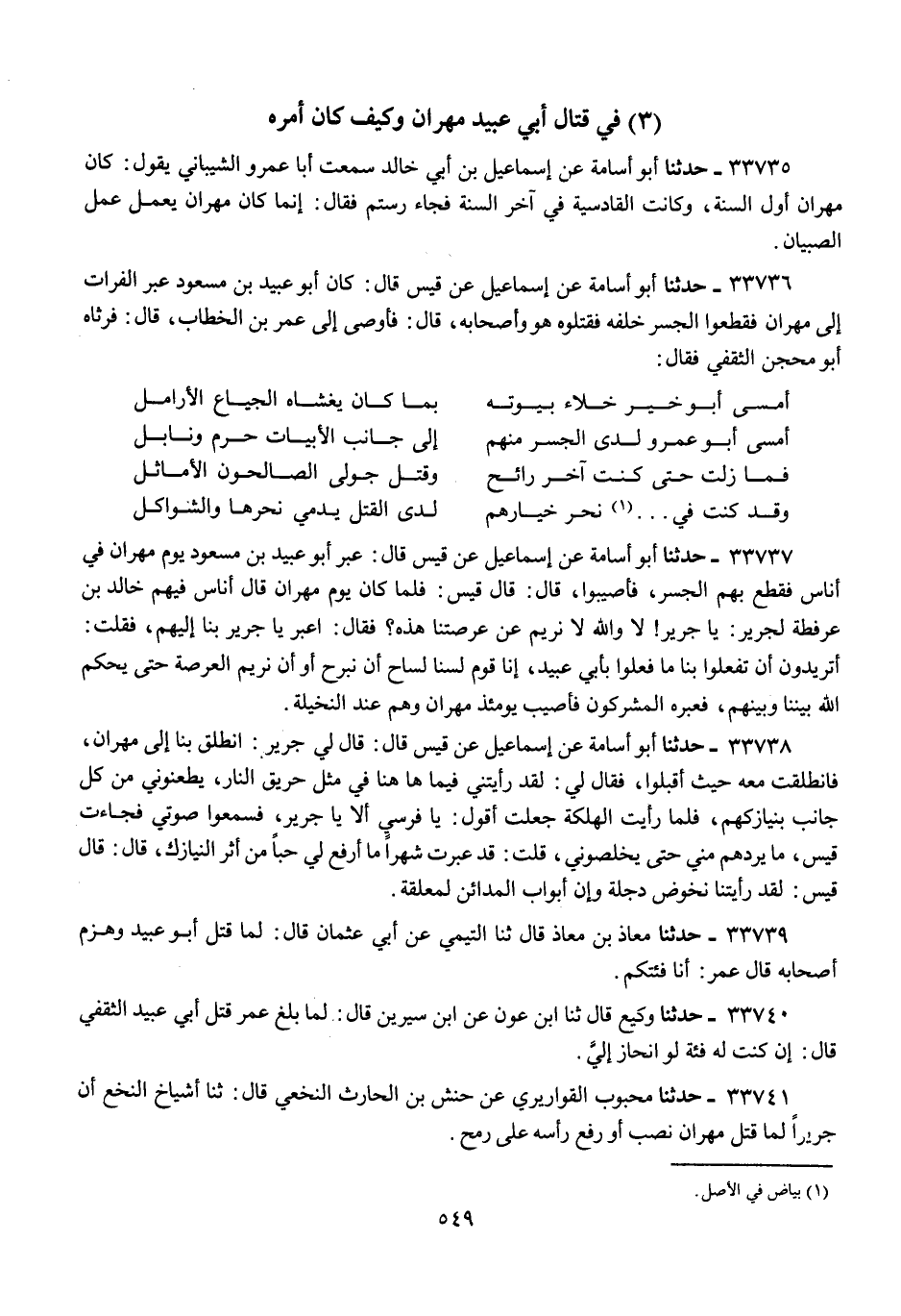 33737 - حَدَّثَنَا أَبُو أُسَامَةَ، عَنْ إِسْمَاعِيلَ، عَنْ قَيْسٍ، قَالَ: عَبَرَ أَبُو عُبَيْدِ بْنُ مَسْعُودٍ يَوْمَ مِهْرَانَ فِي أُنَاسٍ، فَقَطَعَ بِهِمُ الْجِسْرَ , فَأُصِيبُوا , قَالَ: قَالَ قَيْسٌ: فَلَمَّا كَانَ يَوْمُ مِهْرَانَ، قَالَ أُنَاسٌ فِيهِمْ خَالِدُ بْنُ عُرْفُطَةَ لِجَرِيرٍ: يَا جَرِيرُ , لَا وَاللَّهِ لَا نَرِيمُ عَنْ عَرْصَتِنَا هَذِهِ؟ فَقَالَ: اعْبُرْ يَا جَرِيرُ بِنَا إِلَيْهِمْ , فَقُلْتُ: أَتُرِيدُونَ إِنْ تَفْعَلُوا بِنَا مَا فَعَلُوا بِأَبِي عُبَيْدٍ , §إِنَّا قَوْمٌ لَسْنَا لَسَاحَ إِنْ نَبْرَحَ أَوْ إِنْ نَرِيمَ الْعَرْصَةَ حَتَّى يَحْكُمَ اللَّهُ بَيْنَنَا وَبَيْنَهُمْ , فَعَبَرَهُ الْمُشْرِكُونَ، فَأُصِيبَ يَوْمَئِذٍ مِهْرَانُ وَهُمْ عِنْدَ النَّخِيلَةِ "