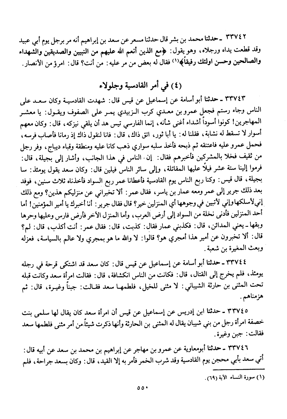 33744 - حَدَّثَنَا أَبُو أُسَامَةَ، عَنْ إِسْمَاعِيلَ، عَنْ قَيْسٍ، قَالَ: كَانَ §سَعْدٌ قَدِ اشْتَكَى قُرْحَةً فِي رِجْلِهِ يَوْمَئِذٍ , فَلَمْ يَخْرُجْ إِلَى الْقِتَالِ , قَالَ: فَكَانَتْ مِنَ النَّاسِ انْكِشَافَةٌ , قَالَ: فَقَالَتِ امْرَأَةُ سَعْدٍ وَكَانَتْ قَبْلَهُ تَحْتَ الْمُثَنَّى بْنِ حَارِثَةَ الشَّيْبَانِيِّ: لَا مُثَنَّى لِلْخَيْلِ , فَلَطَمَهَا سَعْدٌ فَقَالَتْ: جُبْنًا وَغَيْرَةً , قَالَ: ثُمَّ هَزَمْنَاهُمْ