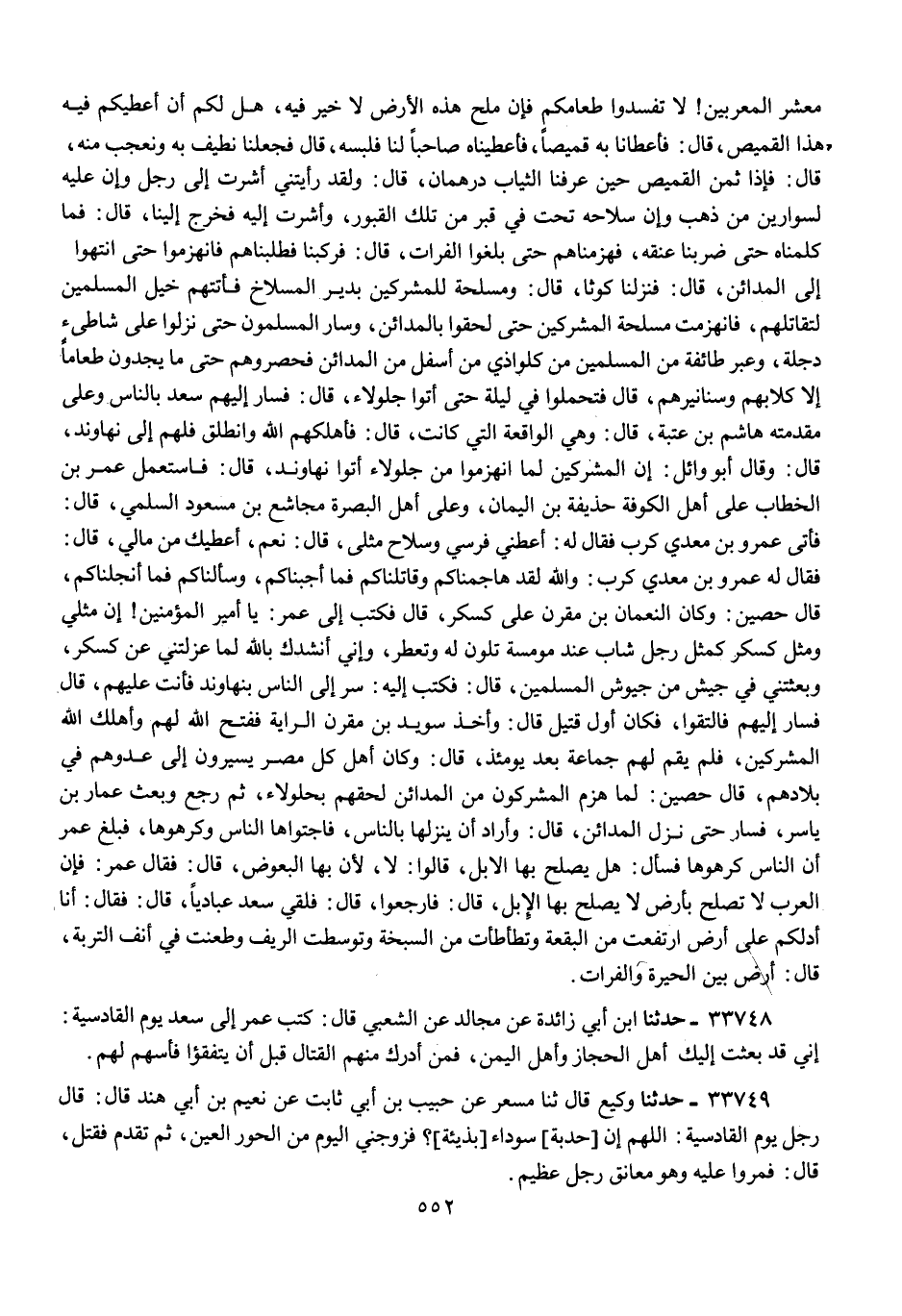 33748 - حَدَّثَنَا ابْنُ أَبِي زَائِدَةَ، عَنْ مُجَالِدٍ، عَنِ الشَّعْبِيِّ، قَالَ: كَتَبَ عُمَرُ إِلَى سَعْدٍ يَوْمَ الْقَادِسِيَّةِ: إِنِّي §قَدْ بَعَثْتُ إِلَيْكَ أَهْلَ الْحِجَازِ وَأَهْلَ الْيَمَنِ , فَمَنْ أَدْرَكَ مِنْهُمُ الْقِتَالَ قَبْلَ أَنْ يَتَفَقَّأُوا فَأَسْهُمٌ لَهُمْ "