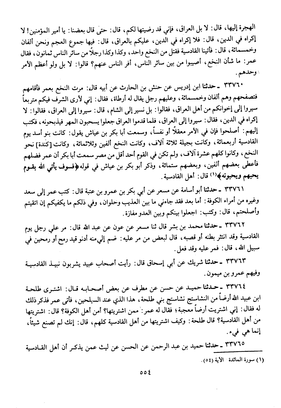 33760 - حَدَّثَنَا ابْنُ إِدْرِيسَ، عَنْ حَنَشِ بْنِ الْحَارِثِ، عَنْ أَبِيهِ، قَالَ: مَرَّتِ النَّخْعُ بِعُمَرَ فَأَقَامَهُمْ فَتَصَفَّحَهُمْ وَهُمْ أَلْفَانِ وَخَمْسُمِائَةٍ , وَعَلَيْهِمْ رَجُلٌ يُقَالُ لَهُ أَرْطَاةُ , فَقَالَ: إِنِّي §لَأَرَى الشَّرَفَ فِيكُمْ مُتَرَبِّعًا سِيرُوا إِلَى إِخْوَانِكُمْ مِنْ أَهْلِ الْعِرَاقِ , فَقَالُوا: بَلْ نَسِيرُ إِلَى الشَّامِ , قَالَ: سِيرُوا إِلَى الْعِرَاقِ , فَقَالُوا: {لَا إِكْرَاهَ فِي الدِّينِ} [البقرة: 256] , فَقَالَ: سِيرُوا إِلَى الْعِرَاقِ , فَلَمَّا قَدِمُوا الْعِرَاقَ جَعَلُوا يَسْحَبُونَ الْمُهْرَ فَيَذْبَحُونَهُ , فَكَتَبَ إِلَيْهِمْ: أَصْلِحُوا فَإِنَّ فِي الْأَمْرِ مَعْقِلًا أَوْ نَفْسًا , وَسَمِعْتُ أَبَا بَكْرِ بْنَ عَيَّاشٍ يَقُولُ: كَانَتْ بَنُو أَسَدٍ يَوْمَ الْقَادِسِيَّةِ أَرْبَعمِائَةِ , وَكَانَتْ بَجِيلَةُ ثَلَاثَةَ آلَافٍ , وَكَانَتْ النَّخْعُ أَلْفَيْنِ وَثَلَاثَمِائَةٍ , وَكَانَتْ كِنْدَةُ نَحْوَ النَّخْعِ , وَكَانُوا كُلُّهُمْ عَشَرَةَ آلَافٍ , وَلَمْ تَكُنْ فِي الْقَوْمِ أَحَدٌ أَقَلَّ مِنْ مُضَرَ سَمِعْتُ أَبَا بَكْرٍ أَنَّ عُمَرَ فَضَّلَهُمْ فَأَعْطَى بَعْضَهُمْ أَلْفَيْنِ , وَبَعْضَهُمْ سِتَّمِائَةٍ , وَذَكَرَ أَبُو بَكْرِ بْنُ عَيَّاشٍ فِي قَوْلِهِ: {فَسَوْفَ يَأْتِي اللَّهُ بِقَوْمٍ يُحِبُّهُمْ وَيُحِبُّونَهُ} [المائدة: 54] قَالَ: أَهْلُ الْقَادِسِيَّةِ "