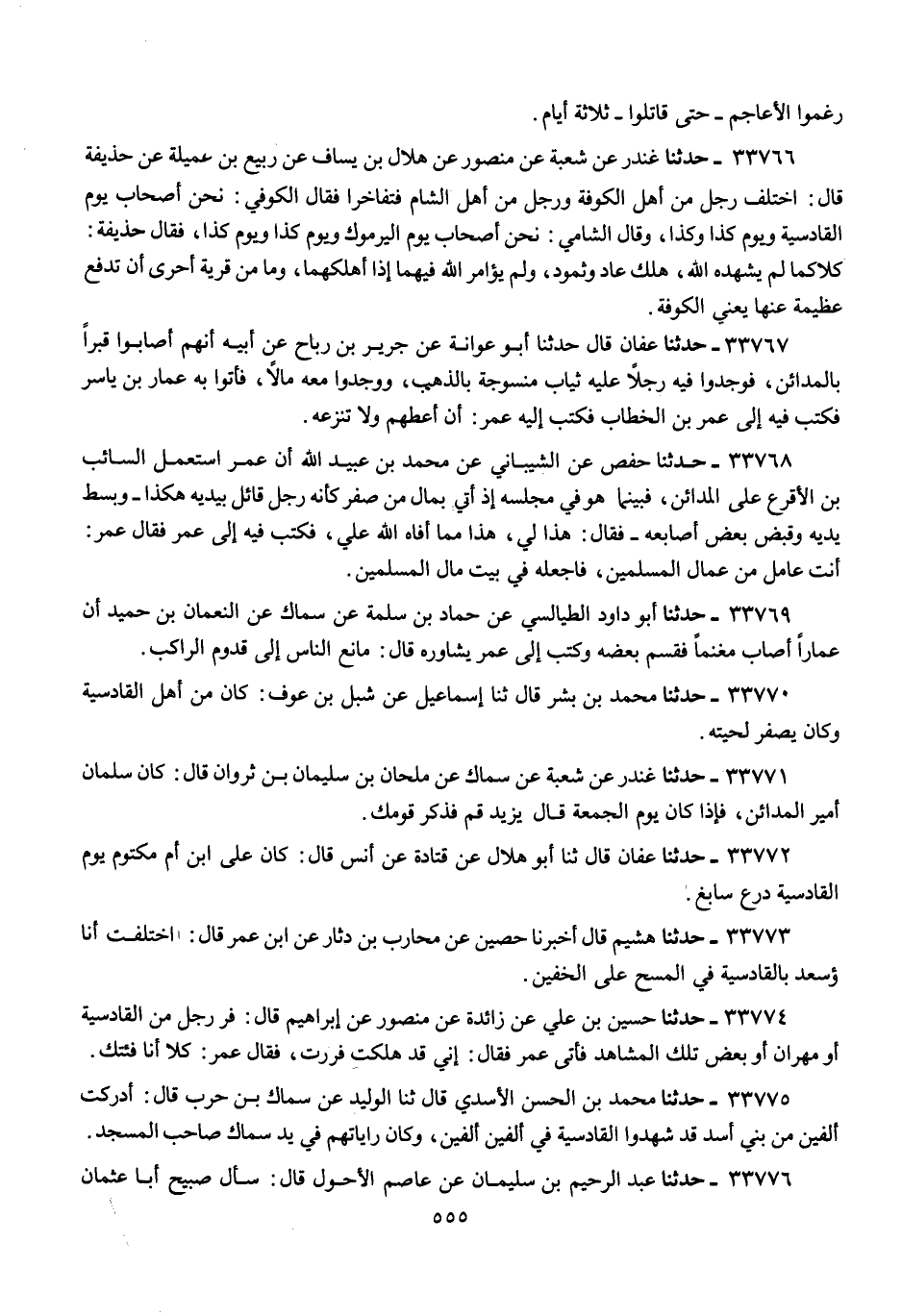 33766 - حَدَّثَنَا غُنْدَرٌ، عَنْ شُعْبَةَ، عَنْ مَنْصُورٍ، عَنْ هِلَالِ بْنِ يَسَافٍ، عَنْ رَبِيعِ بْنِ عُمَيْلَةَ، عَنْ حُذَيْفَةَ، قَالَ: §اخْتَلَفَ رَجُلٌ مِنْ أَهْلِ الْكُوفَةِ وَرَجُلٌ مِنْ أَهْلِ الشَّامِ فَتَفَاخَرَا , فَقَالَ الْكُوفِيُّ: نَحْنُ أَصْحَابُ يَوْمِ الْقَادِسِيَّةِ وَيَوْمِ كَذَا وَكَذَا , وَقَالَ الشَّامِيُّ: نَحْنُ أَصْحَابُ يَوْمِ الْيَرْمُوكِ وَيَوْمِ كَذَا وَيَوْمِ كَذَا , فَقَالَ حُذَيْفَةُ: كِلَاكُمَا لَمْ يُشْهِدْهُ اللَّهُ , هَلَكَ عَادٌ وَثَمُودُ , وَلَمْ يُؤَامِرِ اللَّهُ فِيهِمَا إِذَا أَهْلَكَهُمَا , وَمَا مِنْ قَرْيَةٍ أَحْرَى أَنْ تَدْفَعَ عَظِيمَةً عَنْهَا يَعْنِي الْكُوفَةَ "