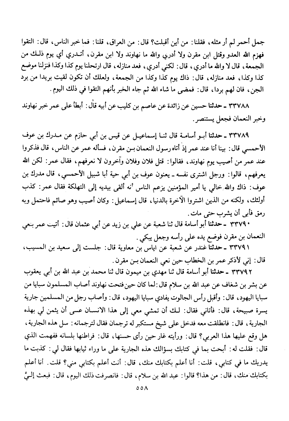 33792 - حَدَّثَنَا أَبُو أُسَامَةَ، قَالَ: ثنا مَهْدِيُّ بْنُ مَيْمُونٍ، قَالَ: ثنا مُحَمَّدُ بْنُ عَبْدِ اللَّهِ بْنِ أَبِي يَعْقُوبَ، عَنْ بِشْرِ بْنِ شَغَافٍ، عَنْ عَبْدِ اللَّهِ بْنِ سَلَامٍ، قَالَ: " §لَمَّا كَانَ حِينَ فُتِحَتْ نَهَاوَنْدُ أَصَابَ الْمُسْلِمُونَ سَبَايَا مِنْ سَبَايَا الْيَهُودِ , قَالَ: وَأَقْبَلَ رَأْسُ الْجَالُوتِ يُفَادِي سَبَايَا الْيَهُودِ , قَالَ: وَأَصَابَ رَجُلٌ مِنَ الْمُسْلِمِينَ جَارِيَةً يَسْرَةً صَبِيحَةً , قَالَ: فَأَتَانِي فَقَالَ: لَكَ أَنْ تَمْشِيَ مَعِي إِلَى هَذَا الْإِنْسَانِ عَسَى أَنْ يُثَمِّنَ لِي بِهَذِهِ الْجَارِيَةِ , قَالَ: فَانْطَلَقْتُ مَعَهُ فَدَخَلَ عَلَى شَيْخٍ مُسْتَكْبِرٍ لَهُ تُرْجُمَانٌ فَقَالَ لِتُرْجُمَانِهِ: سَلْ هَذِهِ الْجَارِيَةَ , هَلْ وَقَعَ عَلَيْهَا هَذَا الْعَرَبِيُّ؟ قَالَ: وَرَأَيْتُهُ غَارَ حِينَ رَأَى حُسْنَهَا , قَالَ: فَرَاطَنَهَا بِلِسَانِهِ فَفَهِمْتُ الَّذِي قَالَ: فَقُلْتُ لَهُ: أَبَحْتَ بِمَا فِي كِتَابِكَ بِسُؤَالِكَ هَذِهِ الْجَارِيَةَ عَلَى مَا وَرَاءَ ثِيَابِهَا , فَقَالَ لِي: كَذَبْتَ مَا يُدْرِيكَ مَا فِي كِتَابِي , قُلْتُ: أَنَا أَعْلَمُ بِكِتَابِكَ مِنْكَ , قَالَ: أَنْتَ أَعْلَمُ بِكِتَابِي مِنِّي؟ قُلْتُ: أَنَا أَعْلَمُ بِكِتَابِكَ مِنْكَ , قَالَ: مَنْ هَذَا؟ قَالُوا: عَبْدُ اللَّهِ بْنُ سَلَامٍ , قَالَ: فَانْصَرَفْتُ ذَلِكَ الْيَوْمَ , قَالَ: فَبَعَثَ إِلَيَّ -[559]- رَسُولًا يَعْزِمُهُ لِيَأْتِيَنِي , قَالَ: وَبَعَثَ إِلَيَّ بِدَابَّةٍ قَالَ: فَانْطَلَقْتُ إِلَيْهِ لَعَمْرُ اللَّهِ احْتِسَابًا رَجَاءَ أَنْ يُسْلِمَ , فَحَبَسَنِي عِنْدَهُ ثَلَاثَةَ أَيَّامٍ أَقْرَأُ عَلَيْهِ التَّوْرَاةَ وَيَبْكِي , قَالَ: وَقُلْتُ لَهُ: إِنَّهُ وَاللَّهِ لَهُوَ النَّبِيُّ الَّذِي تَجِدُونَهُ فِي كِتَابِكُمْ , قَالَ: فَقَالَ لِي: كَيْفَ أَصْنَعُ بِالْيَهُودِ؟ قَالَ: قُلْتُ لَهُ: إِنَّ الْيَهُودَ لَنْ يُغْنُوا عَنْكَ مِنَ اللَّهِ شَيْئًا؟ قَالَ: فَغَلَبَ عَلَيْهِ الشَّقَاءُ وَأَبَى أَنْ يُسْلِمَ "
