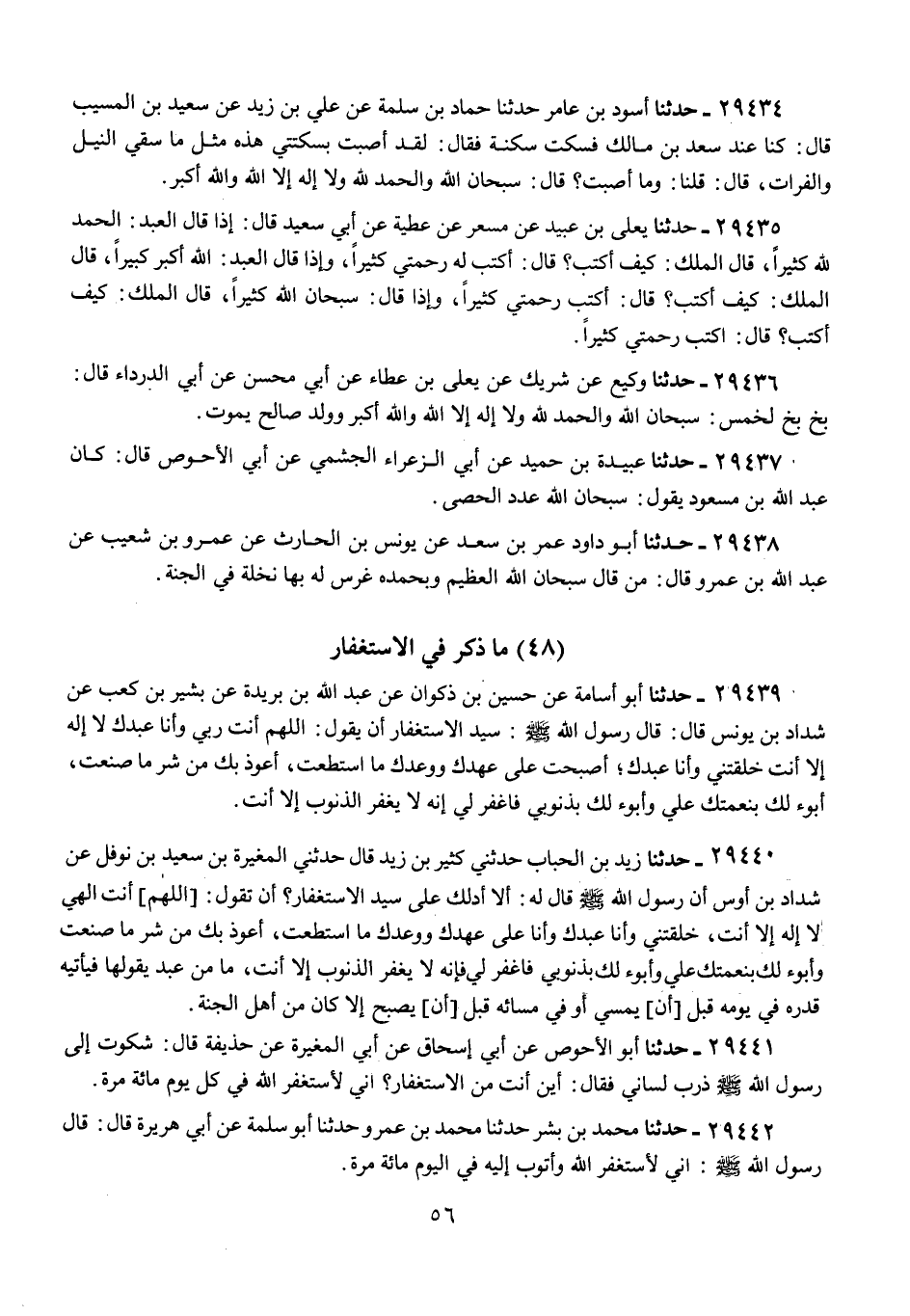29440 - حَدَّثَنَا زَيْدُ بْنُ الْحُبَابِ، حَدَّثَنِي كَثِيرُ بْنُ زَيْدٍ، قَالَ: حَدَّثَنِي الْمُغِيرَةُ بْنُ سَعِيدِ بْنُ نُوَيْفِلٍ، عَنْ شَدَّادِ بْنِ أَوْسٍ، أَنَّ رَسُولَ اللَّهِ صَلَّى اللهُ عَلَيْهِ وَسَلَّمَ، قَالَ لَهُ: " §أَلَا أَدُلُّكَ عَلَى سَيِّدِ الِاسْتِغْفَارِ؟، أَنْ تَقُولَ: أَنْتَ إِلَهِي لَا إِلَهَ إِلَّا أَنْتَ، خَلَقْتنِي وَأَنَا عَبْدُكَ، وَأَنَا عَلَى عَهْدِكَ وَوَعْدِكَ مَا اسْتَطَعْتُ، أَعُوذُ بِكَ مِنْ شَرِّ مَا صَنَعْتُ، وَأَبُوءُ لَكَ بِنِعْمَتِكَ عَلَيَّ، وَأَبُوءُ لَكَ بِذُنُوبِي، فَاغْفِرْ لِي، فَإِنَّهُ لَا يَغْفِرُ الذُّنُوبَ إِلَّا أَنْتَ، مَا مِنْ عَبْدٍ يَقُولُهَا فَيَأْتِيهِ قَدَرُهُ فِي يَوْمِهِ قَبْلَ يُمْسِيَ، أَوْ فِي مَسَائِهِ قَبْلَ يُصْبِحَ، إِلَّا كَانَ مِنْ أَهْلِ الْجَنَّةِ "