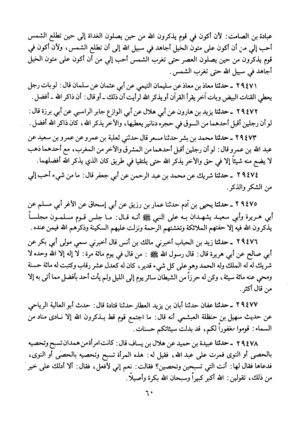 29476 - حَدَّثَنَا زَيْدُ بْنُ الْحُبَابِ، أَخْبَرَنِي مَالِكُ بْنُ أَنَسٍ، قَالَ: أَخْبَرَنِي سُمِيٌّ، مَوْلَى أَبِي بَكْرٍ، عَنْ أَبِي صَالِحٍ، عَنْ أَبِي هُرَيْرَةَ، قَالَ: قَالَ رَسُولُ اللَّهِ صَلَّى اللهُ عَلَيْهِ وَسَلَّمَ: " §مَنْ قَالَ فِي يَوْمٍ مِائَةَ مَرَّةٍ: لَا إِلَهَ إِلَّا اللَّهُ وَحْدَهُ لَا شَرِيكَ لَهُ، لَهُ الْمُلْكُ، وَلَهُ الْحَمْدُ، وَهُوَ عَلَى كُلِّ شَيْءٍ قَدِيرٌ، كَانَ لَهُ كَعَدْلِ عَشْرِ رِقَابٍ، وَكُتِبَتْ لَهُ مِائَةُ حَسَنَةٍ، وَمُحِيَ عَنْهُ مِائَةُ سَيِّئَةٍ، وَكُنَّ لَهُ حِرْزًا مِنَ الشَّيْطَانِ سَائِرَ يَوْمٍ إِلَى اللَّيْلِ، وَلَمْ يَأْتِ أَحَدٌ بِأَفْضَلَ مِمَّا أَتَى بِهِ، إِلَّا مَنْ قَالَ أَكْثَرَ "