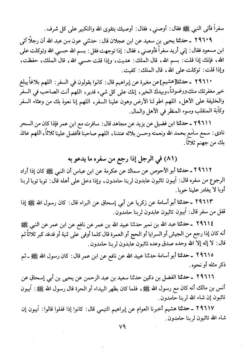 29613 - حَدَّثَنَا أَبُو أُسَامَةَ، عَنْ زَكَرِيَّا، عَنْ أَبِي إِسْحَاقَ، عَنِ الْبَرَاءِ، قَالَ: كَانَ رَسُولُ اللَّهِ صَلَّى اللهُ عَلَيْهِ وَسَلَّمَ §إِذَا قَفَلَ مِنْ سَفَرٍ، قَالَ: «آيِبُونَ، تَائِبُونَ عَابِدُونَ لِرَبِّنَا حَامِدُونَ»