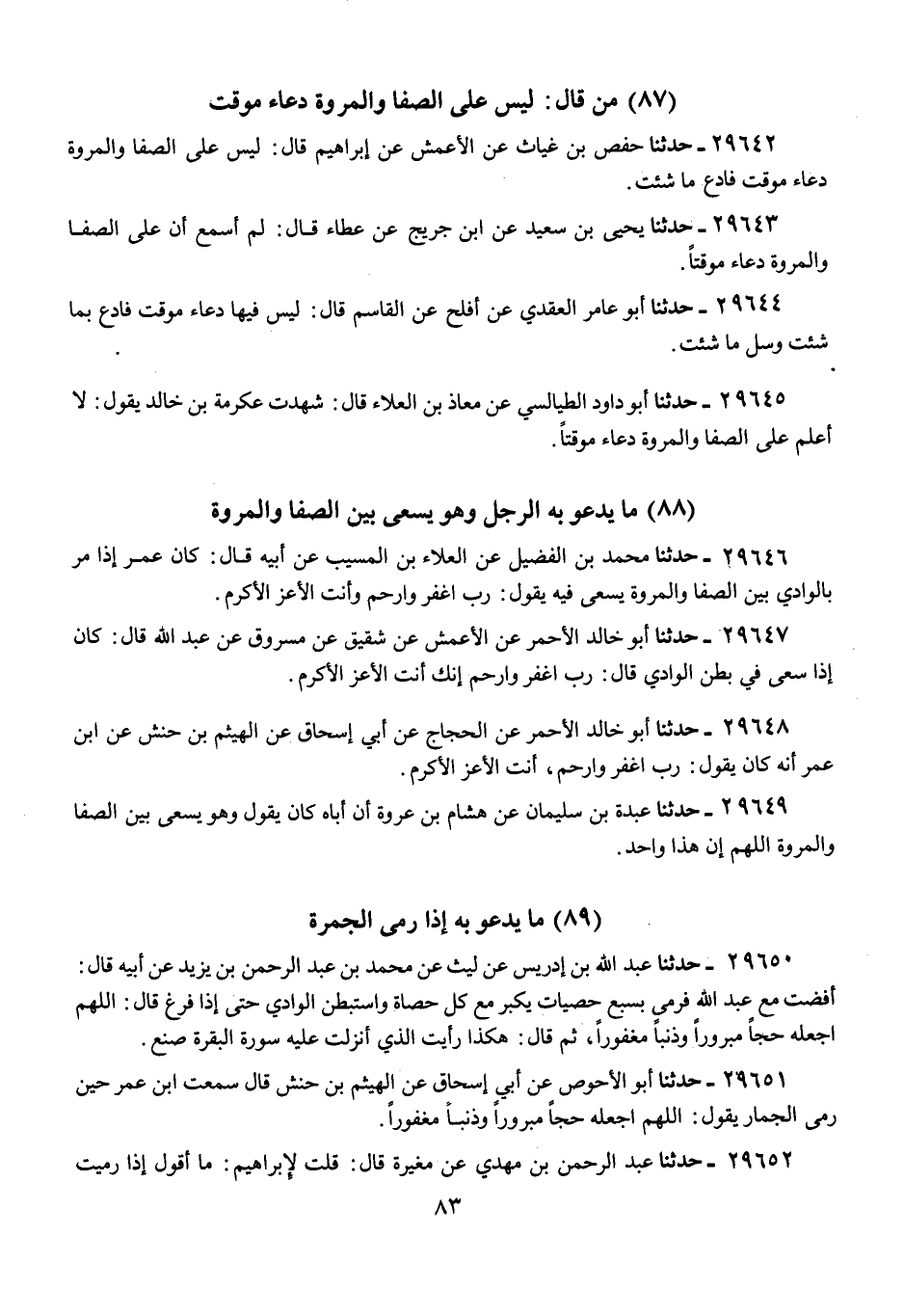 29642 - حَدَّثَنَا حَفْصُ بْنُ غِيَاثٍ، عَنِ الْأَعْمَشِ، عَنْ إِبْرَاهِيمَ، قَالَ: «§لَيْسَ عَلَى الصَّفَا، وَالْمَرْوَةِ دُعَاءٌ مُوَقَّتٌ فَادْعُ مَا شِئْتَ»
