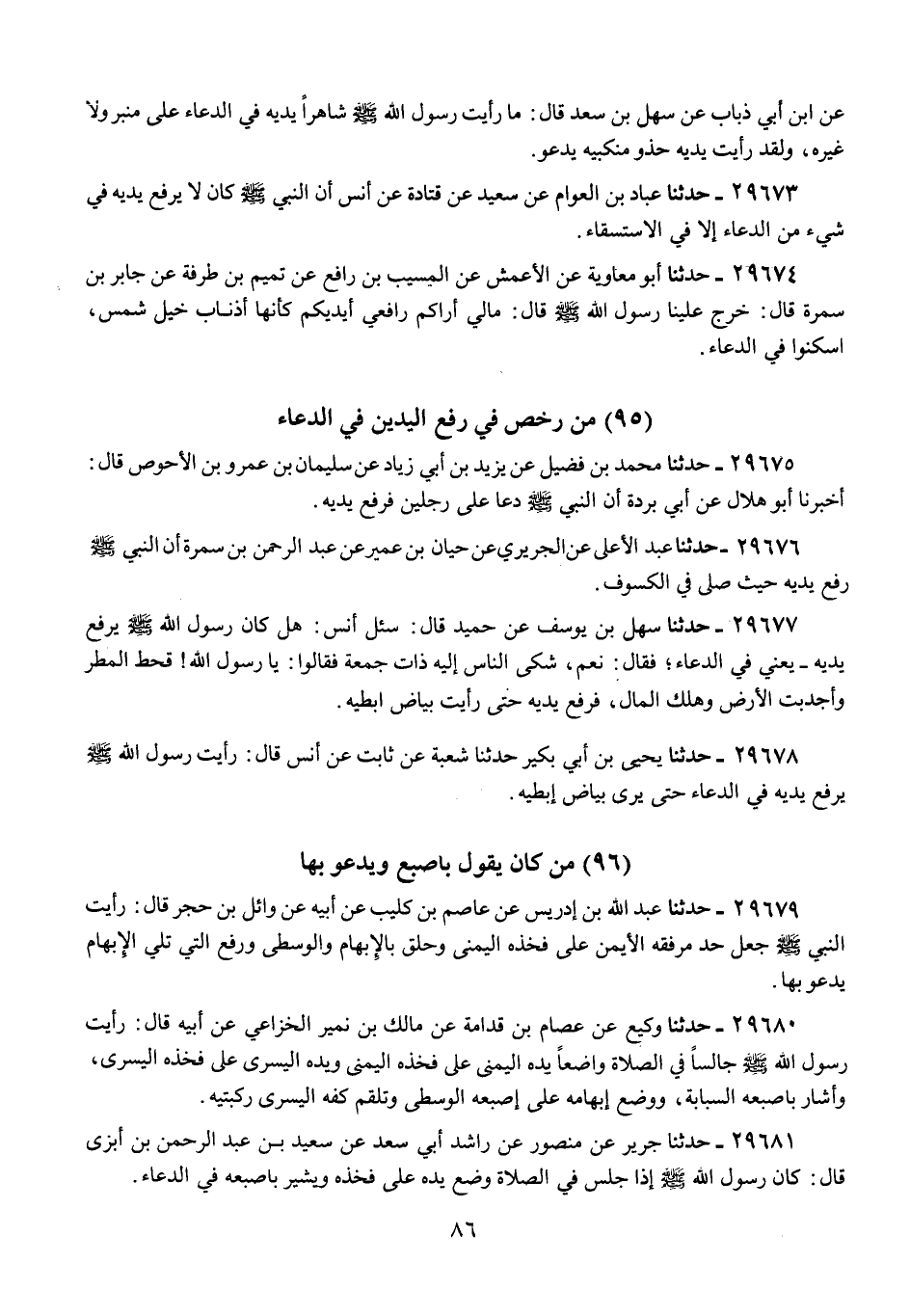 29678 - حَدَّثَنَا يَحْيَى بْنُ أَبِي بُكَيْرٍ، حَدَّثَنَا شُعْبَةُ، عَنْ ثَابِتٍ، عَنْ أَنَسٍ، قَالَ: «رَأَيْتُ رَسُولَ اللَّهِ صَلَّى اللهُ عَلَيْهِ وَسَلَّمَ §يَرْفَعُ يَدَيْهِ فِي الدُّعَاءِ حَتَّى يُرَى بَيَاضُ إِبْطَيْهِ»