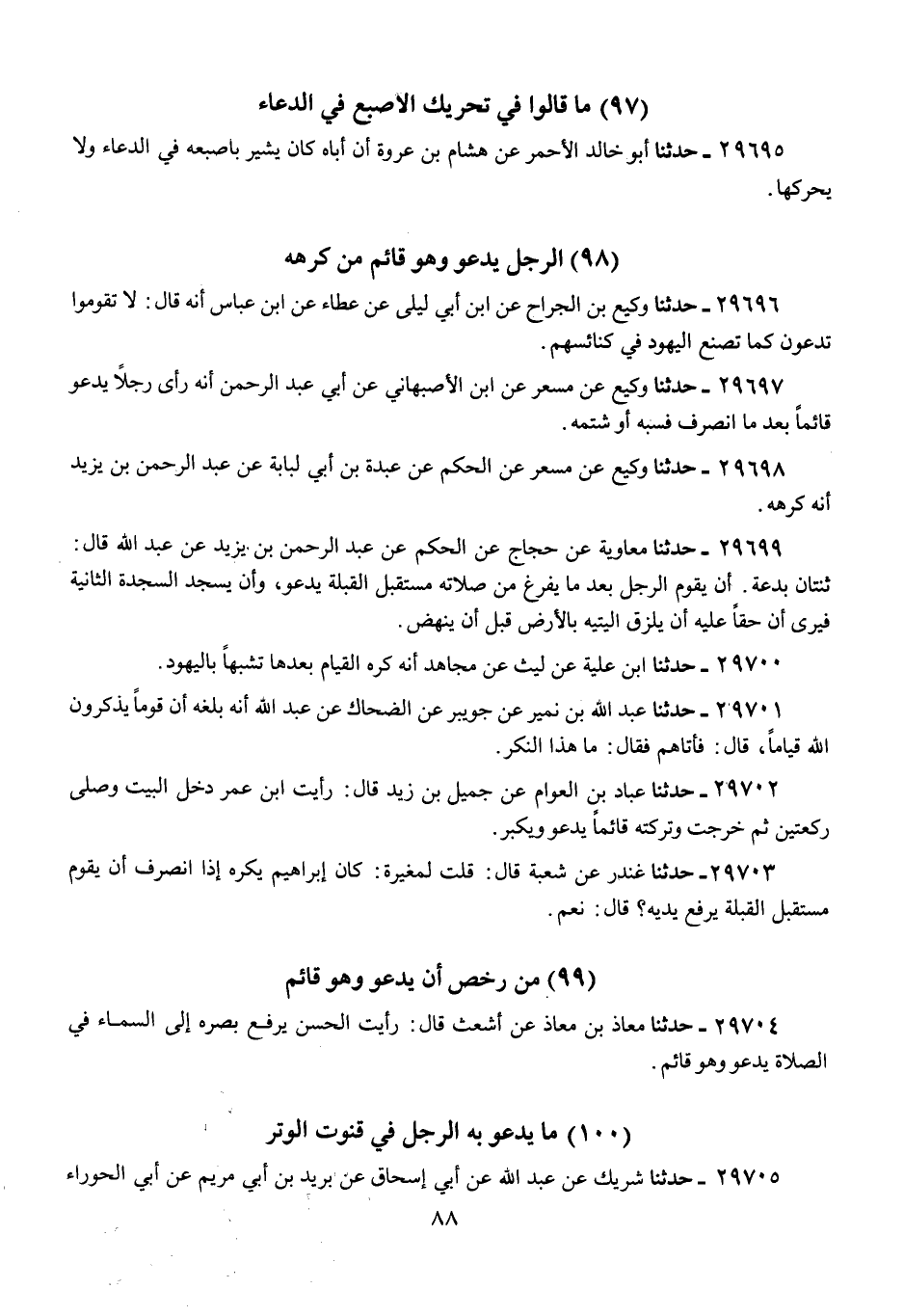 29697 - حَدَّثَنَا وَكِيعٌ، عَنْ مِسْعَرٍ، عَنِ ابْنِ الْأَصْبَهَانِيِّ، عَنْ أَبِي عَبْدِ الرَّحْمَنِ: «أَنَّهُ §رَأَى رَجُلًا يَدْعُو قَائِمًا بَعْدَمَا انْصَرَفَ فَسَبَّهُ أَوْ شَتَمَهُ»