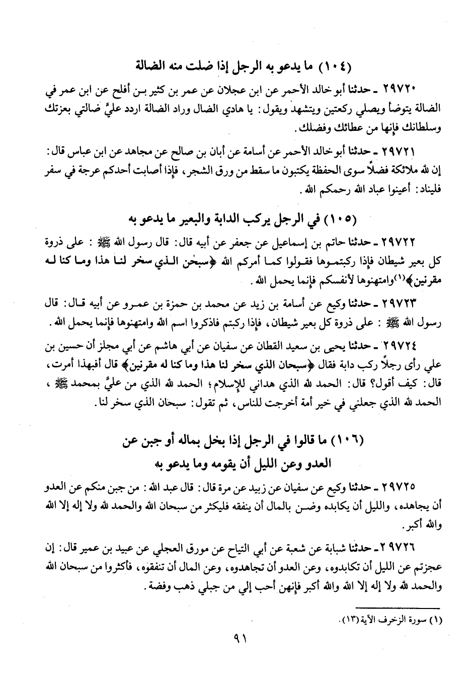 29724 - حَدَّثَنَا يَحْيَى بْنُ سَعِيدٍ الْقَطَّانُ، عَنْ سُفْيَانَ، عَنْ أَبِي هَاشِمٍ، عَنْ أَبِي مِجْلَزٍ، أَنَّ حُسَيْنَ بْنَ عَلِيٍّ رَأَى رَجُلًا رَكِبَ دَابَّةً، فَقَالَ: " {§سُبْحَانَ الَّذِي سَخَّرَ لَنَا هَذَا وَمَا كُنَّا لَهُ مُقْرِنِينَ} [الزخرف: 13] "، قَالَ: أَفَبِهَذَا أُمِرْتَ؟، قَالَ: كَيْفَ أَقُولُ؟، قَالَ: " الْحَمْدُ لِلَّهِ الَّذِي هَدَانِي لِلْإِسْلَامِ الْحَمْدُ لِلَّهِ الَّذِي مَنَّ عَلَيَّ بِمُحَمَّدٍ صَلَّى اللهُ عَلَيْهِ وَسَلَّمَ، الْحَمْدُ لِلَّهِ الَّذِي جَعَلَنِي فِي خَيْرِ أُمَّةٍ أُخْرِجَتْ لِلنَّاسِ، ثُمَّ تَقُولُ: {سُبْحَانَ الَّذِي سَخَّرَ لَنَا} [الزخرف: 13] "