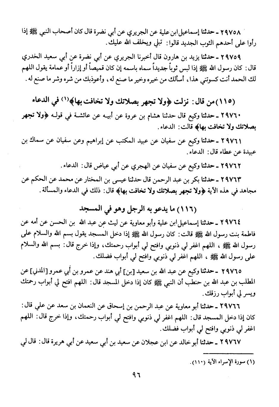 29763 - حَدَّثَنَا بَكْرُ بْنُ عَبْدِ الرَّحْمَنِ، قَالَ: حَدَّثَنَا عِيسَى بْنُ الْمُخْتَارِ، عَنْ مُحَمَّدٍ، عَنِ الْحَكَمِ، عَنْ مُجَاهِدٍ، فِي هَذِهِ الْآيَةِ: {§وَلَا تَجْهَرْ بِصَلَاتِكَ وَلَا تُخَافِتْ بِهَا} [الإسراء: 110]، قَالَ: «ذَلِكَ فِي الدُّعَاءِ وَالْمَسْأَلَةِ»