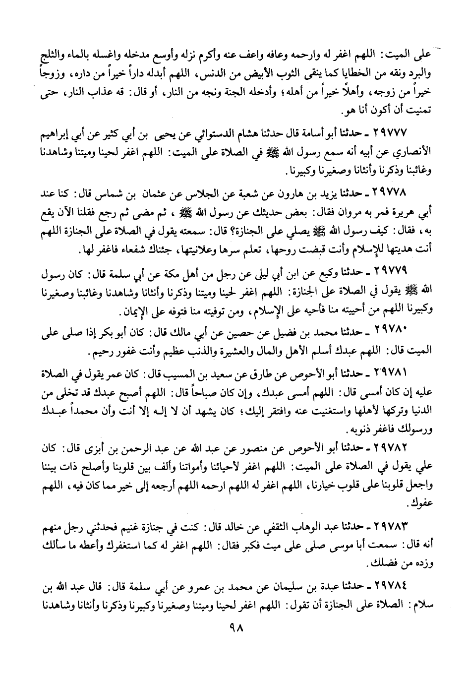 29780 - حَدَّثَنَا مُحَمَّدُ بْنُ فُضَيْلٍ، عَنْ حُصَيْنٍ، عَنْ أَبِي مَالِكٍ قَالَ: كَانَ أَبُو بَكْرٍ §إِذَا صَلَّى عَلَى الْمَيِّتِ، قَالَ: «اللَّهُمَّ عَبْدُكَ أَسْلَمَ الْأَهْلَ وَالْمَالَ وَالْعَشِيرَةَ وَالذَّنْبُ عَظِيمٌ وَأَنْتَ غَفُورٌ رَحِيمٌ»