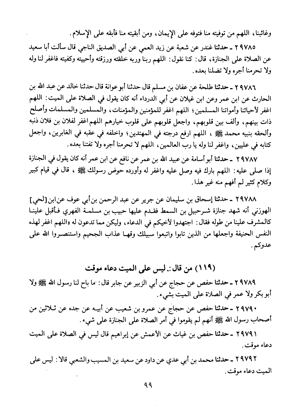 29786 - حَدَّثَنَا طَلْحَةُ، عَنْ عَفَّانَ بْنِ مُسْلِمٍ، قَالَ: حَدَّثَنَا أَبُو عَوَانَةَ، قَالَ: حَدَّثَنَا خَالِدٌ، عَنْ عَبْدِ اللَّهِ بْنِ الْحَارِثِ، عَنِ ابْنِ عُمَرَ، وعنِ ابْنِ غَيْلَانَ، عَنْ أَبِي الدَّرْدَاءِ، أَنَّهُ كَانَ يَقُولُ §فِي الصَّلَاةِ عَلَى الْمَيِّتِ: «اللَّهُمَّ اغْفِرْ لِأَحْيَائِنَا وَأَمْوَاتِنَا الْمُسْلِمِينَ، اللَّهُمَّ اغْفِرْ لِلْمُؤْمِنِينَ وَالْمُؤْمِنَاتِ وَالْمُسْلِمِينَ وَالْمُسْلِمَاتِ وَأَصْلِحْ ذَاتَ بَيْنِهِمْ، وَأَلِّفْ بَيْنَ قُلُوبِهِمْ، وَاجْعَلْ قُلُوبَهُمْ عَلَى قُلُوبِ خِيَارِهِمْ، اللَّهُمَّ اغْفِرْ لِفُلَانِ بْنِ فُلَانٍ ذَنْبَهُ، وَأَلْحِقْهُ بِنَبِيِّهِ مُحَمَّدٍ صَلَّى اللهُ عَلَيْهِ وَسَلَّمَ، اللَّهُمَّ ارْفَعْ دَرَجَتَهُ فِي الْمُهْتَدِينَ، وَاخْلُفْهُ فِي عَقِبِهِ فِي الْغَابِرِينَ، وَاجْعَلْ كِتَابَهُ فِي عَلِيَّيْنِ، وَاغْفِرْ لَنَا وَلَهُ يَا رَبَّ الْعَالَمِينَ، اللَّهُمَّ لَا تَحْرِمْنَا أَجْرَهُ، وَلَا تَفْتِنَّا بَعْدَهُ»