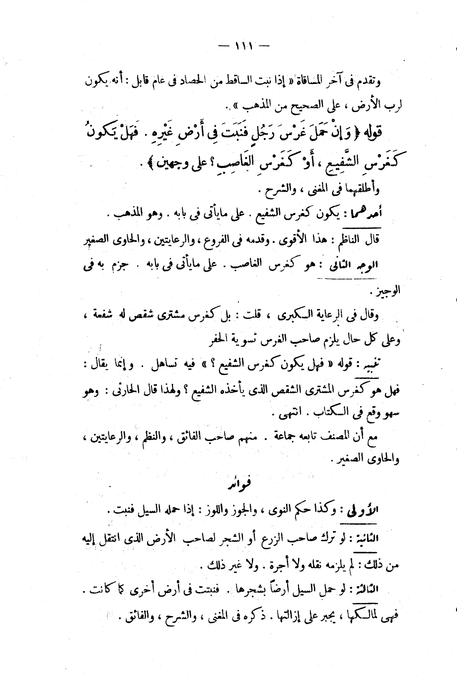 تَنْبِيهٌ: قَوْلُهُ " فَهَلْ يَكُونُ كَغَرْسِ الشَّفِيعِ؟ " فِيهِ تَسَاهُلٌ. وَإِنَّمَا يُقَالُ: فَهَلْ هُوَ كَغَرْسِ الْمُشْتَرِي الشِّقْصَ الَّذِي يَأْخُذُهُ الشَّفِيعُ؟ وَلِهَذَا قَالَ الْحَارِثِيُّ: وَهُوَ سَهْوٌ وَقَعَ فِي الْكِتَابِ. انْتَهَى. مَعَ أَنَّ الْمُصَنِّفَ تَابَعَهُ جَمَاعَةٌ. مِنْهُمْ صَاحِبُ الْفَائِقِ، وَالنَّظْمِ، وَالرِّعَايَتَيْنِ، وَالْحَاوِي الصَّغِيرِ. فَوَائِدُ: الْأُولَى: وَكَذَا حُكْمُ النَّوَى، وَالْجَوْزِ وَاللَّوْزِ: إذَا حَمَلَهُ السَّيْلُ فَنَبَتَ.