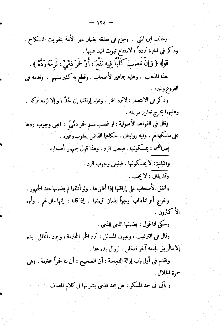 وَالثَّانِيَةُ: لَا يَمْلِكُونَهَا. فَيَنْبَغِي وُجُوبُ الرَّدِّ. وَقَدْ يُقَالُ: لَا يَجِبُ. وَاتَّفَقَ الْأَصْحَابُ عَلَى إرَاقَتِهَا إذَا أَظْهَرَهَا. وَلَوْ أَتْلَفَهَا لَمْ يَضْمَنْهَا عِنْدَ الْجُمْهُورِ. وَخَرَّجَ أَبُو الْخَطَّابِ وَجْهًا بِضَمَانِ قِيمَتِهَا. إذَا قُلْنَا: إنَّهَا مَالٌ لَهُمْ. وَأَبَاهُ الْأَكْثَرُونَ. وَحُكِيَ لَنَا قَوْلٌ: يَضْمَنُهَا الذِّمِّيُّ لِلذِّمِّيِّ. وَقَالَ فِي التَّرْغِيبِ، وَعُيُونِ الْمَسَائِلِ: تُرَدُّ الْخَمْرُ الْمُحْتَرَمَةُ، وَيُرَدُّ مَا تَخَلَّلَ بِيَدِهِ إلَّا مَا أُرِيقَ فَجَمَعَهُ آخَرُ فَتَخَلَّلَ. لِزَوَالِ يَدِهِ هُنَا. وَتَقَدَّمَ فِي أَوَّلِ بَابِ إزَالَةِ النَّجَاسَةِ: أَنَّ الصَّحِيحَ: أَنَّ لَنَا خَمْرًا مُحْتَرَمَةً. وَهِيَ خَمْرَةُ الْخَلَّالِ. وَيَأْتِي فِي حَدِّ الْمُسْكِرِ: هَلْ يُحَدُّ الذِّمِّيُّ بِشُرْبِهَا فِي كَلَامِ الْمُصَنِّفِ.