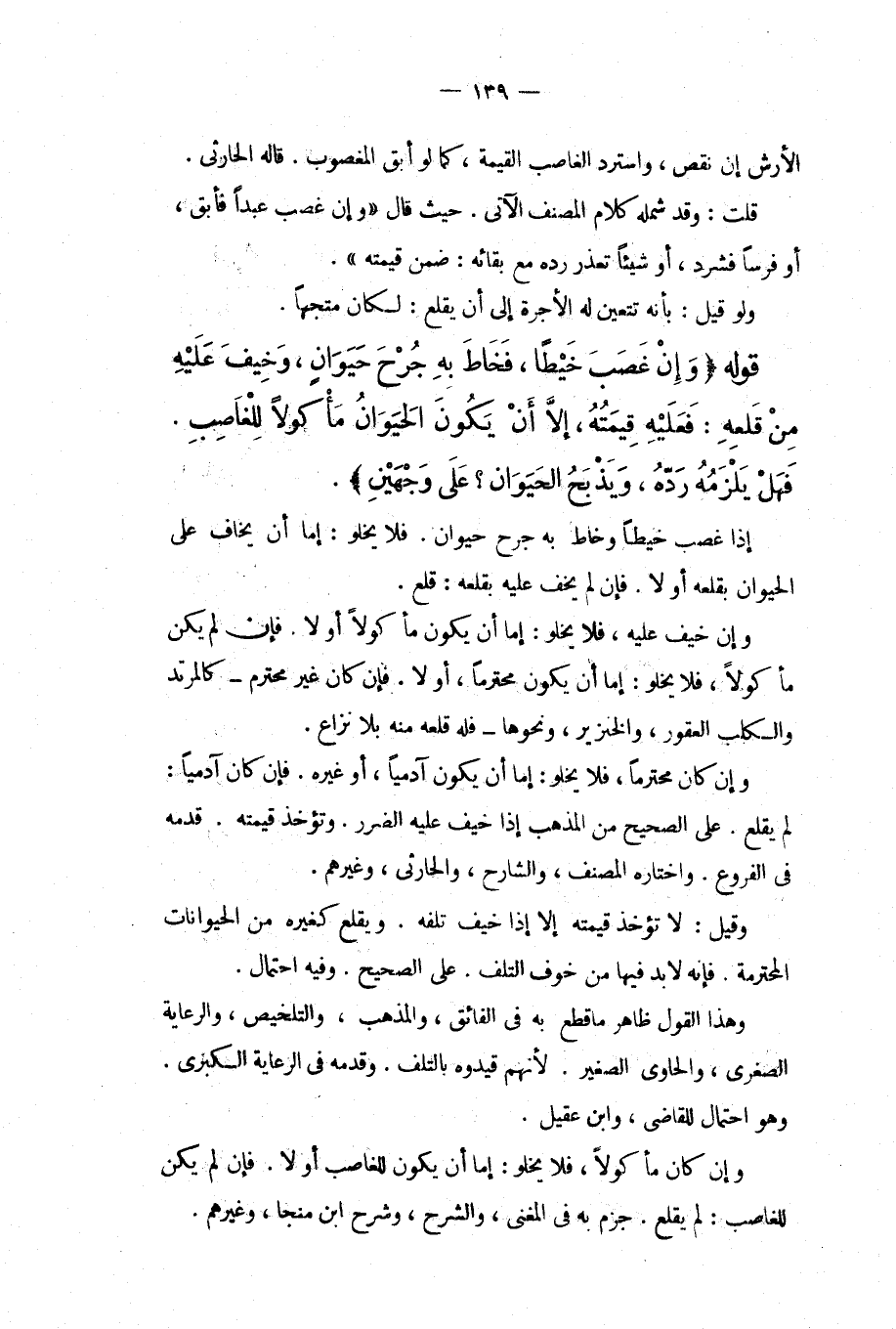 قَوْلُهُ (وَإِنْ غَصَبَ خَيْطًا، فَخَاطَ بِهِ جُرْحَ حَيَوَانٍ، وَخِيفَ عَلَيْهِ مِنْ قَلْعِهِ: فَعَلَيْهِ قِيمَتُهُ، إلَّا أَنْ يَكُونَ الْحَيَوَانُ مَأْكُولًا لِلْغَاصِبِ. فَهَلْ يَلْزَمُهُ رَدُّهُ، وَيَذْبَحُ الْحَيَوَانَ؟ عَلَى وَجْهَيْنِ) . إذَا غَصَبَ خَيْطًا وَخَاطَ بِهِ جُرْحَ حَيَوَانٍ. فَلَا يَخْلُو: إمَّا أَنْ يَخَافَ عَلَى الْحَيَوَانِ بِقَلْعِهِ أَوْ لَا. فَإِنْ لَمْ يَخَفْ عَلَيْهِ بِقَلْعِهِ: قَلَعَ. وَإِنْ خِيفَ عَلَيْهِ، فَلَا يَخْلُو: إمَّا أَنْ يَكُونَ مَأْكُولًا أَوْ لَا. فَإِنْ لَمْ يَكُنْ مَأْكُولًا، فَلَا يَخْلُو: إمَّا أَنْ يَكُونَ مُحْتَرَمًا، أَوْ لَا. فَإِنْ كَانَ غَيْرَ مُحْتَرَمٍ كَالْمُرْتَدِّ وَالْكَلْبِ الْعَقُورِ، وَالْخِنْزِيرِ، وَنَحْوِهَا فَلَهُ قَلْعُهُ مِنْهُ بِلَا نِزَاعٍ. وَإِنْ كَانَ مُحْتَرَمًا، فَلَا يَخْلُو: إمَّا أَنْ يَكُونَ آدَمِيًّا، أَوْ غَيْرَهُ. فَإِنْ كَانَ آدَمِيًّا: لَمْ يُقْلَعْ. عَلَى الصَّحِيحِ مِنْ الْمَذْهَبِ إذَا خِيفَ عَلَيْهِ الضَّرَرُ. وَتُؤْخَذُ قِيمَتُهُ. قَدَّمَهُ فِي الْفُرُوعِ. وَاخْتَارَهُ الْمُصَنِّفُ، وَالشَّارِحُ، وَالْحَارِثِيُّ، وَغَيْرُهُمْ. وَقِيلَ: لَا تُؤْخَذُ قِيمَتُهُ إلَّا إذَا خِيفَ تَلَفُهُ. وَيُقْلَعُ كَغَيْرِهِ مِنْ الْحَيَوَانَاتِ الْمُحْتَرَمَةِ. فَإِنَّهُ لَا بُدَّ فِيهَا مِنْ خَوْفِ التَّلَفِ. عَلَى الصَّحِيحِ. وَفِيهِ احْتِمَالٌ. وَهَذَا الْقَوْلُ. ظَاهِرُ مَا قَطَعَ بِهِ فِي الْفَائِقِ، وَالْمُذْهَبِ، وَالتَّلْخِيصِ، وَالرِّعَايَةِ الصُّغْرَى، وَالْحَاوِي الصَّغِيرِ. لِأَنَّهُمْ قَيَّدُوهُ بِالتَّلَفِ. وَقَدَّمَهُ فِي الرِّعَايَةِ الْكُبْرَى. وَهُوَ احْتِمَالٌ لِلْقَاضِي، وَابْنِ عَقِيلٍ. وَإِنْ كَانَ مَأْكُولًا، فَلَا يَخْلُو: إمَّا أَنْ يَكُونَ لِلْغَاصِبِ أَوْ لَا. فَإِنْ لَمْ يَكُنْ لِلْغَاصِبِ: لَمْ يُقْلَعْ. جَزَمَ بِهِ فِي الْمُغْنِي، وَالشَّرْحِ، وَشَرْحِ ابْنِ مُنَجَّا، وَغَيْرِهِمْ.