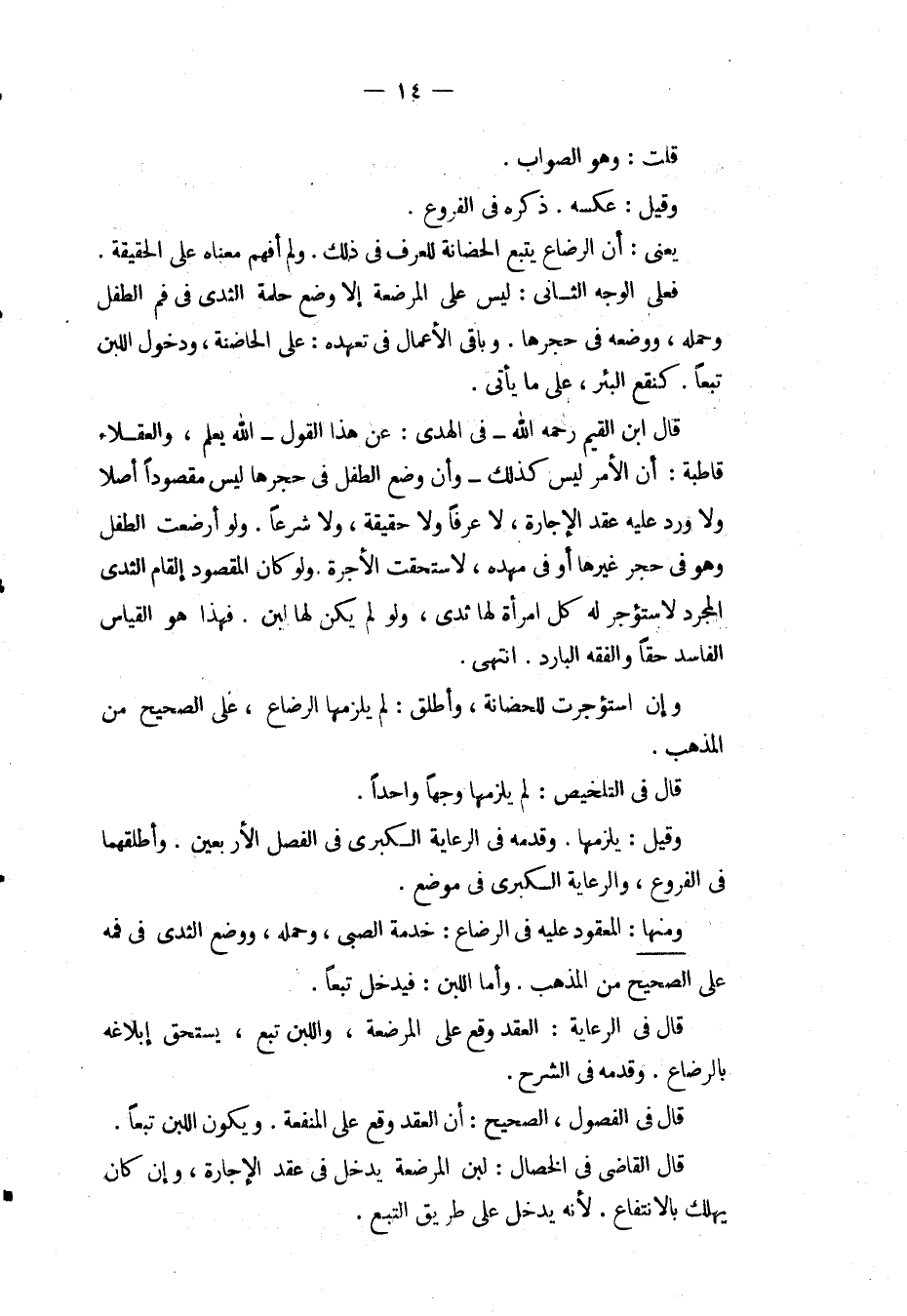 قُلْتُ: وَهُوَ الصَّوَابُ. وَقِيلَ: عَكْسُهُ. ذَكَرَهُ فِي الْفُرُوعِ. يَعْنِي: أَنَّ الرَّضَاعَ يَتْبَعُ الْحَضَانَةَ لِلْعُرْفِ فِي ذَلِكَ. وَلَمْ أَفْهَمْ مَعْنَاهُ عَلَى الْحَقِيقَةِ. فَعَلَى الْوَجْهِ الثَّانِي: لَيْسَ عَلَى الْمُرْضِعَةِ إلَّا وَضْعُ حَلَمَةِ الثَّدْيِ فِي فَمِ الطِّفْلِ وَحَمْلُهُ، وَوَضْعُهُ فِي حِجْرِهَا. وَبَاقِي الْأَعْمَالِ فِي تَعَهُّدِهِ: عَلَى الْحَاضِنَةِ، وَدُخُولُ اللَّبَنِ تَبَعًا. كَنَقْعِ الْبِئْرِ، عَلَى مَا يَأْتِي. قَالَ ابْنُ الْقَيِّمِ - رَحِمَهُ اللَّهُ - فِي الْهَدْيِ: عَنْ هَذَا الْقَوْلِ اللَّهُ يَعْلَمُ، وَالْعُقَلَاءُ قَاطِبَةً: أَنَّ الْأَمْرَ لَيْسَ كَذَلِكَ وَأَنَّ وَضْعَ الطِّفْلِ فِي حِجْرِهَا لَيْسَ مَقْصُودًا أَصْلًا وَلَا وَرَدَ عَلَيْهِ عَقْدُ الْإِجَارَةِ، لَا عُرْفًا وَلَا حَقِيقَةً، وَلَا شَرْعًا. وَلَوْ أَرْضَعَتْ الطِّفْلَ وَهُوَ فِي حِجْرِ غَيْرِهَا أَوْ فِي مَهْدِهِ، لَاسْتَحَقَّتْ الْأُجْرَةَ. وَلَوْ كَانَ الْمَقْصُودُ إلْقَامَ الثَّدْيِ الْمُجَرَّدِ لَاسْتُؤْجِرَ لَهُ كُلُّ امْرَأَةٍ لَهَا ثَدْيٌ، وَلَوْ لَمْ يَكُنْ لَهَا لَبَنٌ. فَهَذَا هُوَ الْقِيَاسُ الْفَاسِدُ حَقًّا وَالْفِقْهُ الْبَارِدُ. انْتَهَى. وَإِنْ اُسْتُؤْجِرَتْ لِلْحَضَانَةِ، وَأَطْلَقَ: لَمْ يَلْزَمْهَا الرَّضَاعُ، عَلَى الصَّحِيحِ مِنْ الْمَذْهَبِ. قَالَ فِي التَّلْخِيصِ: لَمْ يَلْزَمْهَا وَجْهًا وَاحِدًا. وَقِيلَ: يَلْزَمُهَا. وَقَدَّمَهُ فِي الرِّعَايَةِ الْكُبْرَى فِي الْفَصْلِ الْأَرْبَعِينَ. وَأَطْلَقَهُمَا فِي الْفُرُوعِ، وَالرِّعَايَةِ الْكُبْرَى فِي مَوْضِعٍ.
