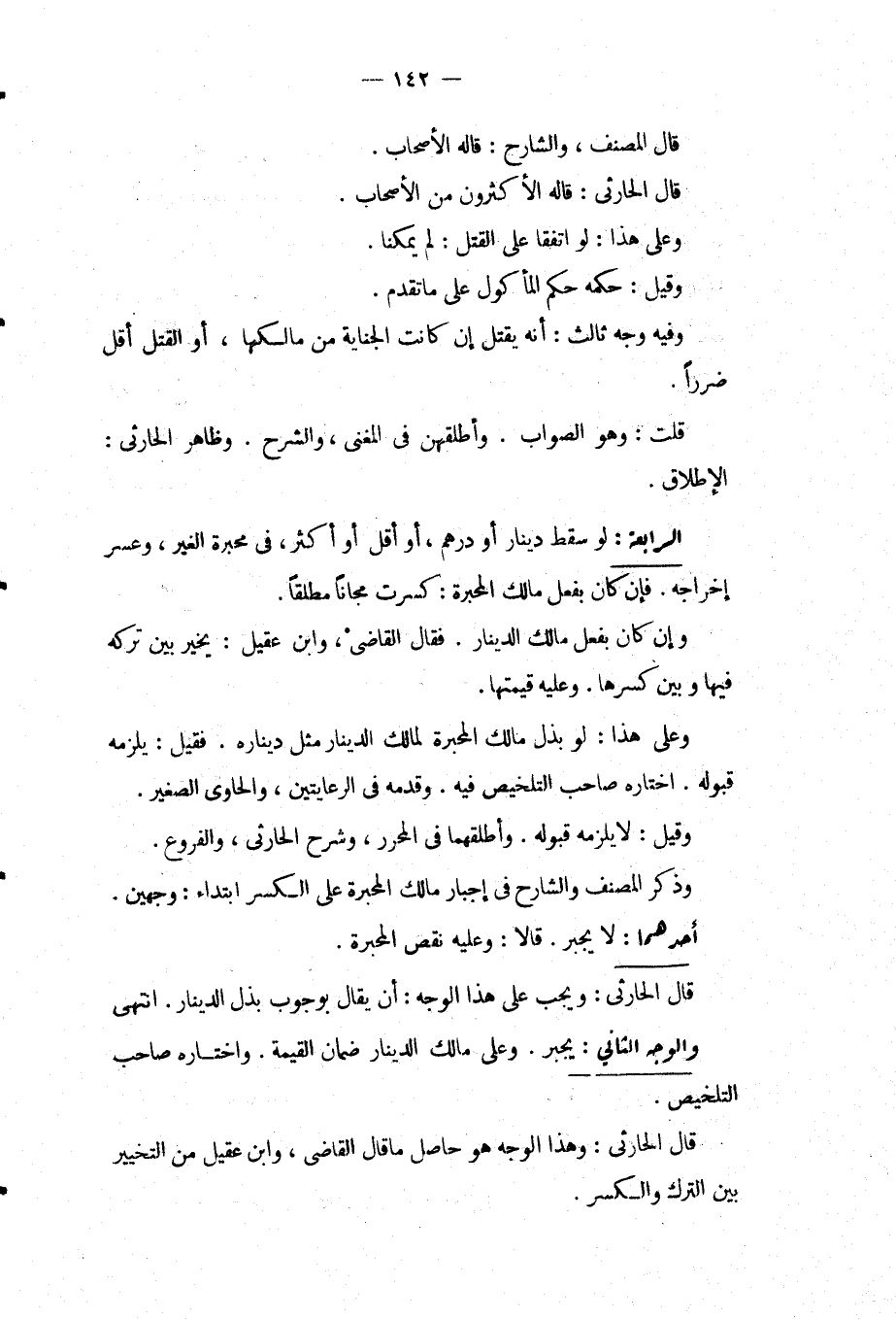 أَحَدُهُمَا: لَا يُجْبَرُ. قَالَا: وَعَلَيْهِ نَقْضُ الْمِحْبَرَةِ. قَالَ الْحَارِثِيُّ: وَيَجِبُ عَلَى هَذَا الْوَجْهِ: أَنْ يُقَالَ بِوُجُوبِ بَذْلِ الدِّينَارِ. انْتَهَى