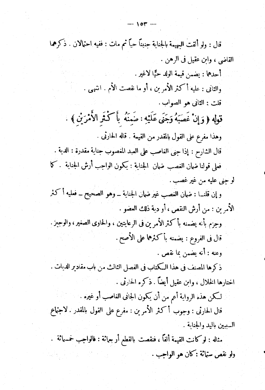 قَوْلُهُ (وَإِنْ غَصَبَهُ وَجَنَى عَلَيْهِ: ضَمِنَهُ بِأَكْثَرِ الْأَمْرَيْنِ) . وَهَذَا مُفَرَّعٌ عَلَى الْقَوْلِ بِالْمُقَدَّرِ مِنْ الْقِيمَةِ. قَالَهُ الْحَارِثِيُّ. قَالَ الشَّارِحُ: إذَا جَنَى الْغَاصِبُ عَلَى الْعَبْدِ الْمَغْصُوبِ جِنَايَةً مُقَدَّرَةً: الدِّيَةُ. فَعَلَى قَوْلِنَا ضَمَانُ الْغَصْبِ ضَمَانُ الْجِنَايَةِ: يَكُونُ الْوَاجِبُ أَرْشَ الْجِنَايَةِ. كَمَا لَوْ جَنَى عَلَيْهِ مِنْ غَيْرِ غَصْبٍ. وَإِنْ قُلْنَا: ضَمَانُ الْغَصْبِ غَيْرُ ضَمَانِ الْجِنَايَةِ وَهُوَ الصَّحِيحُ فَعَلَيْهِ أَكْثَرُ الْأَمْرَيْنِ: مِنْ أَرْشِ النَّقْصِ، أَوْ دِيَةِ ذَلِكَ الْعُضْوِ. وَجَزَمَ بِأَنَّهُ يَضْمَنُهُ بِأَكْثَرَ الْأَمْرَيْنِ فِي الرِّعَايَتَيْنِ، وَالْحَاوِي الصَّغِيرِ، وَالْوَجِيزِ. قَالَ فِي الْفُرُوعِ: يَضْمَنُهُ بِأَكْثَرِهِمَا عَلَى الْأَصَحِّ. عَنْهُ: أَنَّهُ يَضْمَنُ بِمَا نَقَصَ. ذَكَرَهَا الْمُصَنِّفُ فِي هَذَا الْكِتَابِ فِي الْفَصْلِ الثَّالِثِ مِنْ بَابِ مَقَادِيرِ الدِّيَاتِ. اخْتَارَهَا الْخَلَّالُ، وَابْنُ عَقِيلٍ أَيْضًا. ذَكَرَهُ الْحَارِثِيُّ. لَكِنْ هَذِهِ الرِّوَايَةُ أَعَمُّ مِنْ أَنْ يَكُونَ الْجَانِي الْغَاصِبَ أَوْ غَيْرَهُ. قَالَ الْحَارِثِيُّ: وُجُوبُ أَكْثَرِ الْأَمْرَيْنِ: مُفَرَّعٌ عَلَى الْقَوْلِ بِالْمُقَدَّرِ. لِاجْتِمَاعِ السَّبَبَيْنِ بِالْيَدِ وَالْجِنَايَةِ. مِثَالُهُ: لَوْ كَانَتْ الْقِيمَةُ أَلْفًا، فَنَقَصَتْ بِالْقَطْعِ أَرْبَعَمِائَةٍ: فَالْوَاجِبُ خَمْسُمِائَةٍ. وَلَوْ نَقَصَ سِتَّمِائَةٍ: كَانَ هُوَ الْوَاجِبَ.