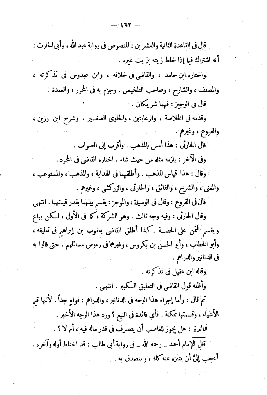 قَالَ فِي الْقَاعِدَةِ الثَّانِيَةِ وَالْعِشْرِينَ: الْمَنْصُوصُ فِي رِوَايَةِ عَبْدِ اللَّهِ، وَأَبِي الْحَارِثِ: أَنَّهُ اشْتِرَاكٌ فِيمَا إذَا خَلَطَ زَيْتَهُ بِزَيْتِ غَيْرِهِ. وَاخْتَارَهُ ابْنُ حَامِدٍ، وَالْقَاضِي فِي خِلَافِهِ، وَابْنُ عَبْدُوسٍ فِي تَذْكِرَتِهِ، وَالْمُصَنِّفُ، وَالشَّارِحُ، وَصَاحِبُ التَّلْخِيصِ. وَجَزَمَ بِهِ فِي الْمُحَرَّرِ، وَالْعُمْدَةِ. قَالَ فِي الْوَجِيزِ: فَهُمَا شَرِيكَانِ. وَقَدَّمَهُ فِي الْخُلَاصَةِ، وَالرِّعَايَتَيْنِ، وَالْحَاوِي الصَّغِيرِ، وَشَرْحِ ابْنِ رَزِينٍ، وَالْفُرُوعِ، وَغَيْرِهِمْ. قَالَ الْحَارِثِيُّ: هَذَا أَمَسُّ بِالْمَذْهَبِ. وَأَقْرَبُ إلَى الصَّوَابِ. وَفِي الْآخَرِ: يَلْزَمُهُ مِثْلُهُ مِنْ حَيْثُ شَاءَ. اخْتَارَهُ الْقَاضِي فِي الْمُجَرَّدِ. وَقَالَ: هَذَا قِيَاسُ الْمَذْهَبِ وَأَطْلَقَهُمَا فِي الْهِدَايَةِ، وَالْمُذْهَبِ، وَالْمُسْتَوْعِبِ، وَالْمُغْنِي، وَالشَّرْحِ، وَالْفَائِقِ، وَالْحَارِثِيِّ، وَالزَّرْكَشِيِّ، وَغَيْرِهِمْ. قَالَ فِي الْفُرُوعِ: وَقَالَ فِي الْوَسِيلَةِ، وَالْمُوجِزِ: يُقْسَمُ بَيْنَهُمَا بِقَدْرِ قِيمَتِهِمَا. انْتَهَى وَقَالَ الْحَارِثِيُّ: وَفِيهِ وَجْهٌ ثَالِثٌ. وَهُوَ الشَّرِكَةُ كَمَا فِي الْأَوَّلِ، لَكِنْ يُبَاعُ وَيُقْسَمُ الثَّمَنُ عَلَى الْحِصَّةِ. كَذَا أَطْلَقَ الْقَاضِي يَعْقُوبُ بْنُ إبْرَاهِيمَ فِي تَعْلِيقِهِ، وَأَبُو الْخَطَّابِ، وَأَبُو الْحَسَنِ بْنُ بَكْرُوسٍ، وَغَيْرُهُمَا فِي رُءُوسِ مَسَائِلِهِمْ. حَتَّى قَالُوا بِهِ فِي الدَّنَانِيرِ وَالدَّرَاهِمِ. وَقَالَهُ ابْنُ عَقِيلٍ فِي تَذْكِرَتِهِ. وَأَظُنُّهُ قَوْلَ الْقَاضِي فِي التَّعْلِيقِ الْكَبِيرِ. انْتَهَى. ثُمَّ قَالَ: وَأَمَّا إجْرَاءُ هَذَا الْوَجْهِ فِي الدَّنَانِيرِ، وَالدَّرَاهِمِ: فَوَاهٍ جِدًّا. لِأَنَّهَا قِيَمُ الْأَشْيَاءِ، وَقِسْمَتُهَا مُمْكِنَةٌ. فَأَيُّ فَائِدَةٍ فِي الْبَيْعِ؟ وَرَدَّ هَذَا الْوَجْهَ الْأَخِيرَ.