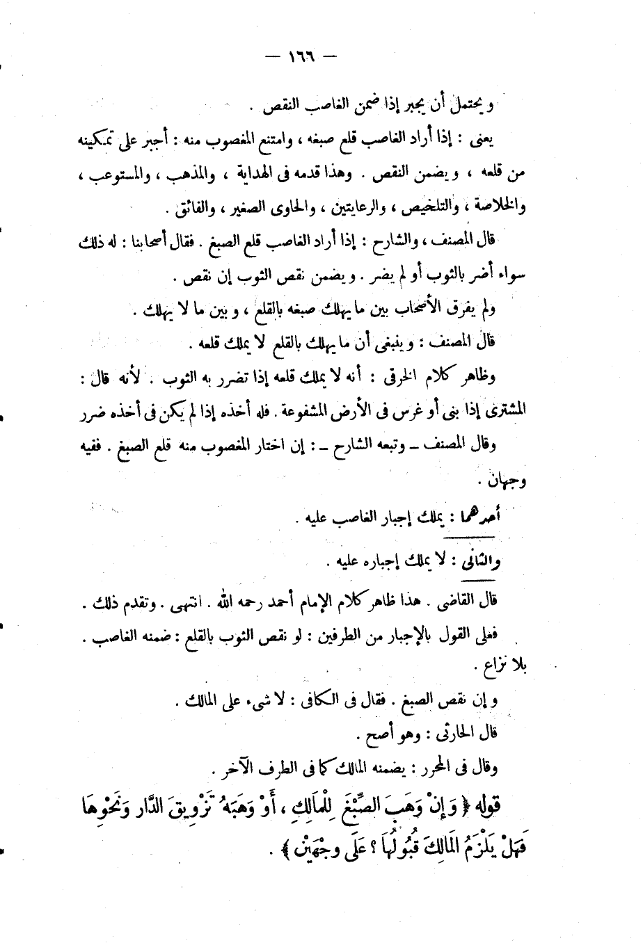 وَيَحْتَمِلُ أَنْ يُجْبَرَ إذَا ضَمِنَ الْغَاصِبُ النَّقْصَ يَعْنِي: إذَا أَرَادَ الْغَاصِبُ قَلْعَ صَبْغِهِ، وَامْتَنَعَ الْمَغْصُوبُ مِنْهُ: أُجْبِرَ عَلَى تَمْكِينِهِ مِنْ قَلْعِهِ، وَيَضْمَنُ النَّقْصَ. وَهَذَا قَدَّمَهُ فِي الْهِدَايَةِ، وَالْمُذْهَبِ، وَالْمُسْتَوْعِبِ، وَالْخُلَاصَةِ، وَالتَّلْخِيصِ، وَالرِّعَايَتَيْنِ، وَالْحَاوِي الصَّغِيرِ، وَالْفَائِقِ. قَالَ الْمُصَنِّفُ، وَالشَّارِحُ: إذَا أَرَادَ الْغَاصِبُ قَلْعَ الصِّبْغِ. فَقَالَ أَصْحَابُنَا: لَهُ ذَلِكَ سَوَاءٌ أَضَرَّ بِالثَّوْبِ أَوْ لَمْ يَضُرَّ. وَيَضْمَنُ نَقْصَ الثَّوْبِ إنْ نَقَصَ. وَلَمْ يُفَرِّقْ الْأَصْحَابُ بَيْنَ مَا يَهْلِكُ صِبْغُهُ بِالْقَلْعِ، وَبَيْنَ مَا لَا يَهْلِكُ. قَالَ الْمُصَنِّفُ: وَيَنْبَغِي أَنَّ مَا يَهْلِكُ بِالْقَلْعِ لَا يَمْلِكُ قَلْعَهُ. وَظَاهِرُ كَلَامِ الْخِرَقِيُّ: أَنَّهُ لَا يَمْلِكُ قَلْعَهُ إذَا تَضَرَّرَ بِهِ الثَّوْبُ. لِأَنَّهُ قَالَ: الْمُشْتَرِي إذَا بَنَى أَوْ غَرَسَ فِي الْأَرْضِ الْمَشْفُوعَةِ. فَلَهُ أَخْذُهُ إذَا لَمْ يَكُنْ فِي أَخْذِهِ ضَرَرٌ، وَقَالَ الْمُصَنِّفُ وَتَبِعَهُ الشَّارِحُ: إنْ اخْتَارَ الْمَغْصُوبُ مِنْهُ قَلْعَ الصِّبْغِ. فَفِيهِ وَجْهَانِ.