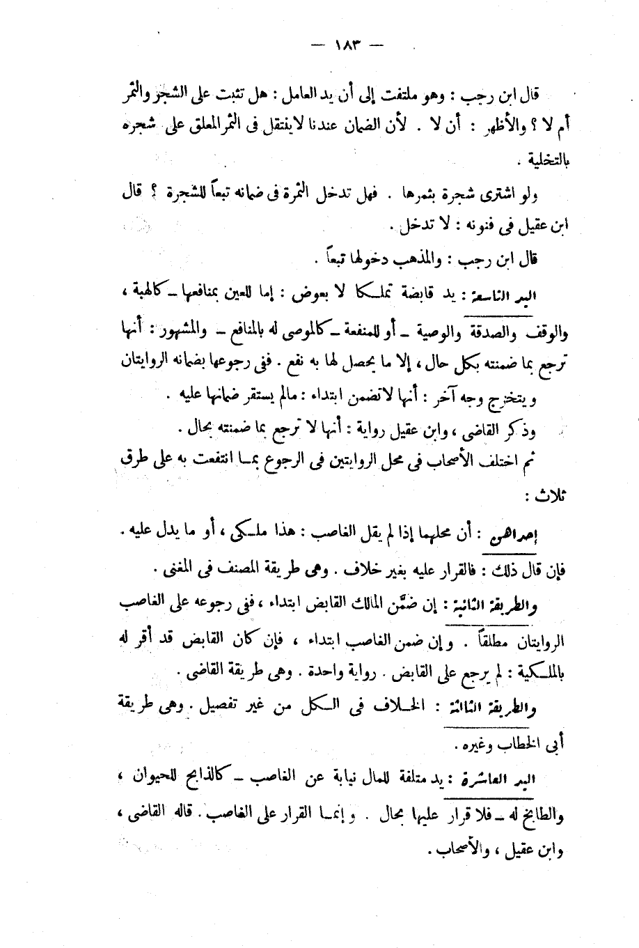 قَالَ ابْنُ رَجَبٍ: وَهُوَ مُلْتَفِتٌ إلَى أَنَّ يَدَ الْعَامِلِ: هَلْ يَثْبُتُ عَلَى الشَّجَرِ وَالثَّمَرِ أَمْ لَا؟ وَالْأَظْهَرُ: أَنْ لَا. لِأَنَّ الضَّمَانَ عِنْدَنَا لَا يَنْتَقِلُ فِي الثَّمَرِ الْمُعَلَّقِ عَلَى شَجَرِهِ بِالتَّخْلِيَةِ. وَلَوْ اشْتَرَى شَجَرَةً بِثَمَرِهَا. فَهَلْ تَدْخُلُ الثَّمَرَةُ فِي ضَمَانِهِ تَبَعًا لِلشَّجَرَةِ؟ قَالَ ابْنُ عَقِيلٍ فِي فُنُونِهِ: لَا تَدْخُلُ. قَالَ ابْنُ رَجَبٍ: وَالْمَذْهَبُ دُخُولُهَا تَبَعًا.