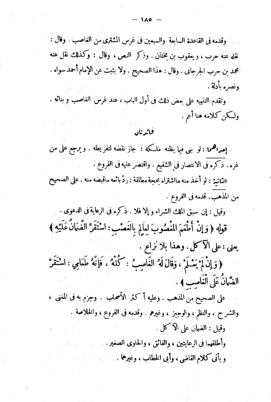 وَقَدَّمَهُ فِي الْقَاعِدَةِ السَّابِعَةِ وَالسَّبْعِينَ فِي غَرْسِ الْمُشْتَرِي مِنْ الْغَاصِبِ. وَقَالَ: نَقَلَهُ عَنْهُ حَرْبٌ، وَيَعْقُوبُ بْنُ بُخْتَانَ. وَذَكَرَ النَّصَّ، وَقَالَ: وَكَذَلِكَ نَقَلَ عَنْهُ مُحَمَّدُ بْنُ حَرْبٍ الْجُرْجَانِيُّ. وَقَالَ: هَذَا الصَّحِيحُ. وَلَا يَثْبُتُ عَنْ الْإِمَامِ أَحْمَدَ سِوَاهُ. وَنَصَرَهُ بِأَدِلَّةٍ. وَتَقَدَّمَ التَّنْبِيهُ عَلَى بَعْضِ ذَلِكَ فِي أَوَّلِ الْبَابِ، عِنْدَ غَرْسِ الْغَاصِبِ وَبِنَائِهِ. وَلَكِنَّ كَلَامَهُ هُنَا أَعَمُّ.