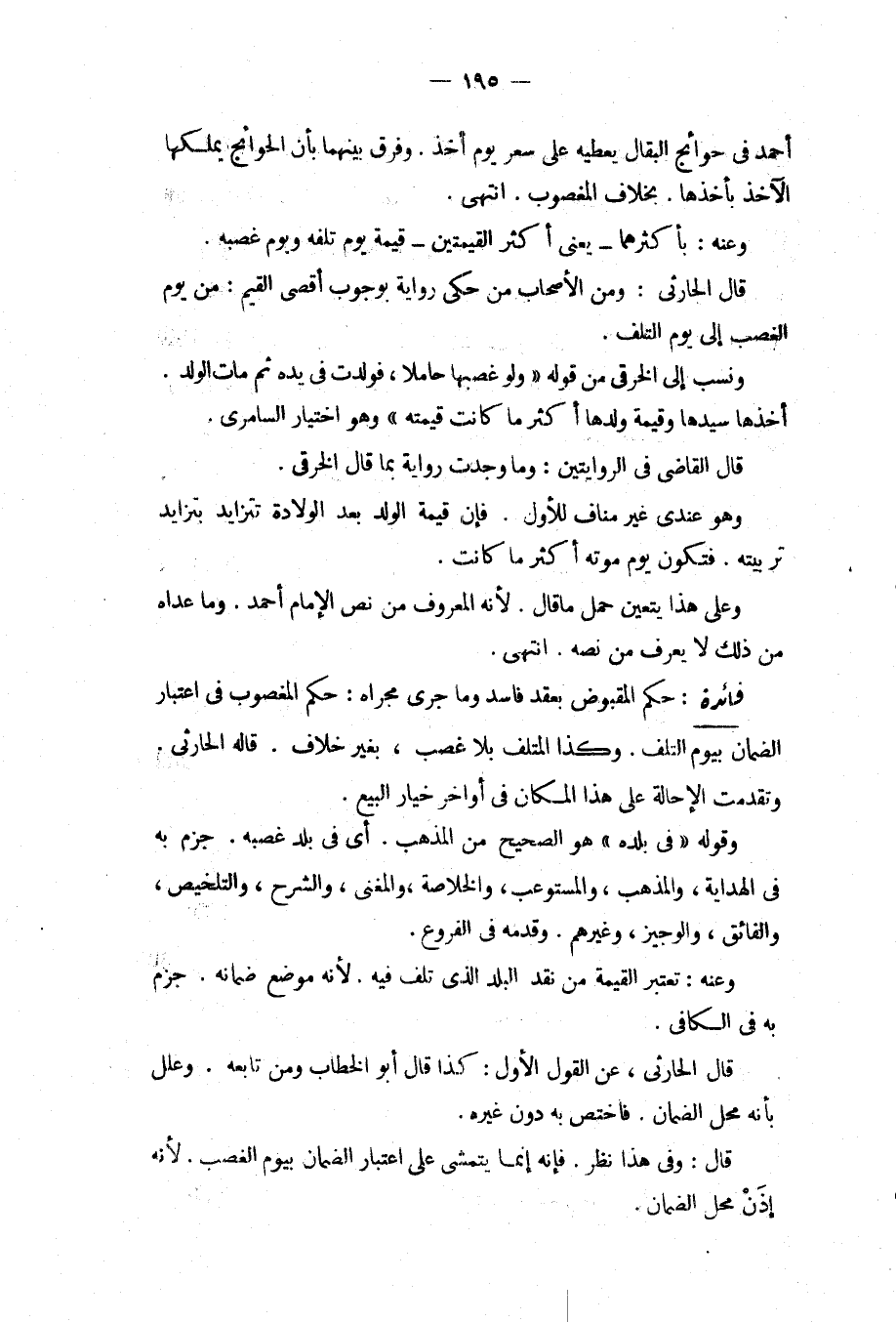 الْإِمَامِ أَحْمَدَ فِي حَوَائِجِ الْبَقَّالِ يُعْطِيهِ عَلَى سِعْرِ يَوْمِ أَخَذَ. وَفَرَّقَ بَيْنَهُمَا بِأَنَّ الْحَوَائِجَ يَمْلِكُهَا الْآخِذُ بِأَخْذِهَا. بِخِلَافِ الْمَغْصُوبِ. انْتَهَى. وَعَنْهُ: بِأَكْثَرِهِمَا يَعْنِي أَكْثَرَ الْقِيمَتَيْنِ قِيمَةُ يَوْمِ تَلَفِهِ وَيَوْمِ غَصْبِهِ. قَالَ الْحَارِثِيُّ: وَمِنْ الْأَصْحَابِ مَنْ حَكَى رِوَايَةً بِوُجُوبِ أَقْصَى الْقِيَمِ: مِنْ يَوْمِ الْغَصْبِ إلَى يَوْمِ التَّلَفِ. وَنُسِبَ إلَى الْخِرَقِيِّ مِنْ قَوْلِهِ " وَلَوْ غَصَبَهَا حَامِلًا، فَوَلَدَتْ فِي يَدِهِ ثُمَّ مَاتَ الْوَلَدُ. أَخَذَهَا سَيِّدُهَا وَقِيمَةُ وَلَدِهَا أَكْثَرُ مَا كَانَتْ قِيمَتُهُ " وَهُوَ اخْتِيَارُ السَّامِرِيِّ. قَالَ الْقَاضِي فِي الرِّوَايَتَيْنِ: وَمَا وُجِدَتْ رِوَايَةٌ بِمَا قَالَ الْخِرَقِيُّ. وَهُوَ عِنْدِي غَيْرُ مَنَافٍ لِلْأَوَّلِ. فَإِنَّ قِيمَةَ الْوَلَدِ بَعْدَ الْوِلَادَةِ تَتَزَايَدُ بِتَزَايُدِ تَرْبِيَتِهِ. فَتَكُونُ يَوْمَ مَوْتِهِ أَكْثَرَ مَا كَانَتْ. وَعَلَى هَذَا يَتَعَيَّنُ حَمْلُ مَا قَالَ. لِأَنَّهُ الْمَعْرُوفُ مِنْ نَصِّ الْإِمَامِ أَحْمَدَ. وَمَا عَدَاهُ مِنْ ذَلِكَ لَا يُعْرَفُ مِنْ نَصِّهِ. انْتَهَى.
