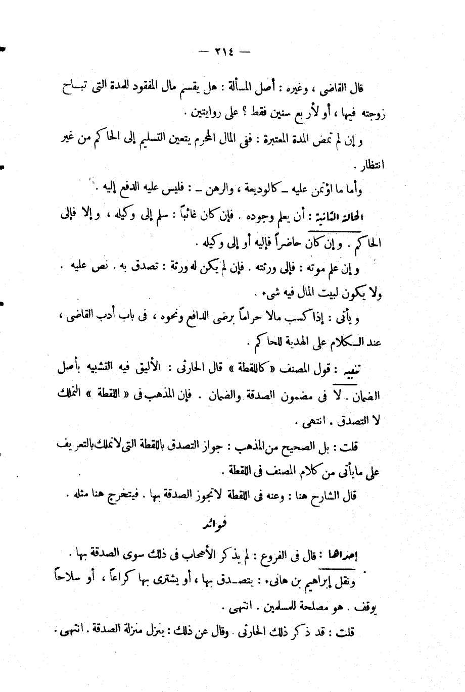 تَنْبِيهٌ: قَوْلُ الْمُصَنِّفِ " كَاللُّقَطَةِ " قَالَ الْحَارِثِيُّ: الْأَلْيَقُ فِيهِ التَّشْبِيهُ بِأَصْلِ الضَّمَانِ. لَا فِي مَضْمُونِ الصَّدَقَةِ وَالضَّمَانِ. فَإِنَّ الْمَذْهَبَ فِي " اللُّقَطَةِ " التَّمَلُّكُ لَا التَّصَدُّقُ. انْتَهَى. قُلْت: بَلْ الصَّحِيحُ مِنْ الْمَذْهَبِ: جَوَازُ التَّصَدُّقِ بِاللُّقَطَةِ الَّتِي لَا تُمْلَكُ بِالتَّعْرِيفِ عَلَى مَا يَأْتِي مِنْ كَلَامِ الْمُصَنِّفِ فِي اللُّقَطَةِ. قَالَ الشَّارِحُ هُنَا: وَعَنْهُ فِي اللُّقَطَةِ لَا تَجُوزُ الصَّدَقَةُ بِهَا. فَيَتَخَرَّجُ هُنَا مِثْلُهُ. فَوَائِدُ
