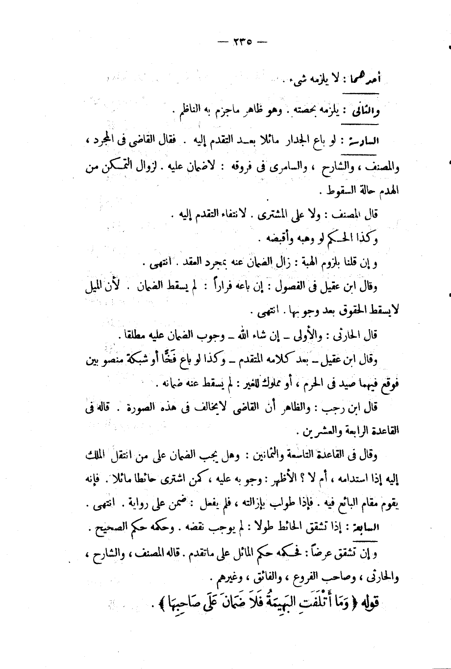 السَّادِسَةُ: لَوْ بَاعَ الْجِدَارَ مَائِلًا بَعْدَ التَّقَدُّمِ إلَيْهِ. فَقَالَ الْقَاضِي فِي الْمُجَرَّدِ، وَالْمُصَنِّفُ، وَالشَّارِحُ، وَالسَّامِرِيُّ فِي فُرُوقِهِ: لَا ضَمَانَ عَلَيْهِ. لِزَوَالِ التَّمَكُّنِ مِنْ الْهَدْمِ حَالَةَ السُّقُوطِ. قَالَ الْمُصَنِّفُ: وَلَا عَلَى الْمُشْتَرِي. لِانْتِفَاءِ التَّقَدُّمِ إلَيْهِ. وَكَذَا الْحَكَمُ لَوْ وَهَبَهُ وَأَقْبَضَهُ. وَإِنْ قُلْنَا بِلُزُومِ الْهِبَةِ: زَالَ الضَّمَانُ عَنْهُ بِمُجَرَّدِ الْعَقْدِ. انْتَهَى. وَقَالَ ابْنُ عَقِيلٍ فِي الْفُصُولِ: إنْ بَاعَهُ فِرَارًا: لَمْ يَسْقُطْ الضَّمَانُ. لِأَنَّ الْمَيْلَ لَا يُسْقِطُ الْحُقُوقَ بَعْدَ وُجُوبِهَا. انْتَهَى. قَالَ الْحَارِثِيُّ: وَالْأَوْلَى إنْ شَاءَ اللَّهُ وُجُوبُ الضَّمَانِ عَلَيْهِ مُطْلَقًا. وَقَالَ ابْنُ عَقِيلٍ بَعْدَ كَلَامِهِ الْمُتَقَدِّمِ وَكَذَا لَوْ بَاعَ فَخًّا أَوْ شَبَكَةً مَنْصُوبَيْنِ فَوَقَعَ فِيهِمَا صَيْدٌ فِي الْحَرَمِ، أَوْ مَمْلُوكٌ لِلْغَيْرِ: لَمْ يَسْقُطْ عَنْهُ ضَمَانُهُ. قَالَ ابْنُ رَجَبٍ: وَالظَّاهِرُ أَنَّ الْقَاضِيَ لَا يُخَالِفُ فِي هَذِهِ الصُّورَةِ. قَالَهُ فِي الْقَاعِدَةِ الرَّابِعَةِ وَالْعِشْرِينَ. وَقَالَ فِي الْقَاعِدَةِ التَّاسِعَةِ وَالثَّمَانِينَ: وَهَلْ يَجِبُ الضَّمَانُ عَلَى مَنْ انْتَقَلَ الْمِلْكُ إلَيْهِ إذَا اسْتَدَامَهُ، أَمْ لَا؟ الْأَظْهَرُ: وُجُوبُهُ عَلَيْهِ، كَمَنْ اشْتَرَى حَائِطًا مَائِلًا. فَإِنَّهُ يَقُومُ مَقَامَ الْبَائِعِ فِيهِ. فَإِذَا طُولِبَ بِإِزَالَتِهِ، فَلَمْ يَفْعَلْ: ضَمِنَ عَلَى رِوَايَةٍ. انْتَهَى.