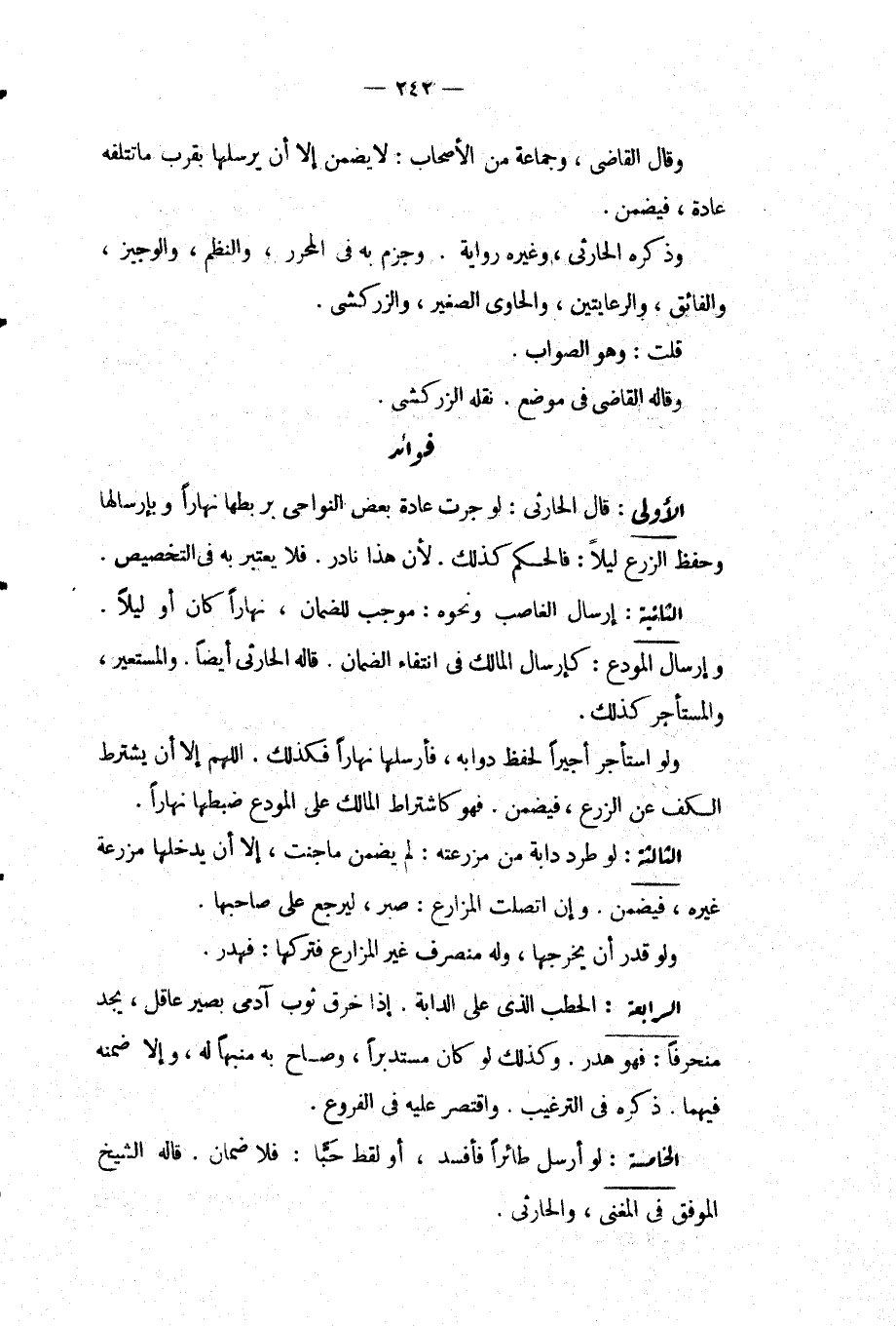 فَوَائِدُ: الْأُولَى: قَالَ الْحَارِثِيُّ: لَوْ جَرَتْ عَادَةُ بَعْضِ النَّوَاحِي بِرَبْطِهَا نَهَارًا وَبِإِرْسَالِهَا وَحِفْظِ الزَّرْعِ لَيْلًا: فَالْحُكْمُ كَذَلِكَ. لِأَنَّ هَذَا نَادِرٌ. فَلَا يُعْتَبَرُ بِهِ فِي التَّخْصِيصِ.