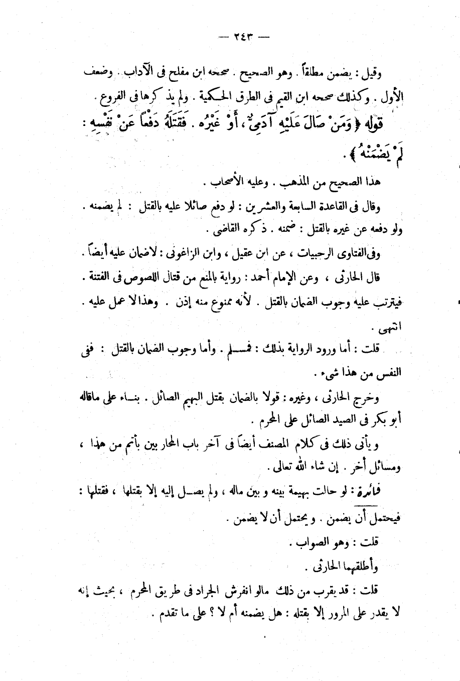 قَوْلُهُ (وَمَنْ صَالَ عَلَيْهِ آدَمِيٌّ، أَوْ غَيْرُهُ. فَقَتَلَهُ دَفْعًا عَنْ نَفْسِهِ: لَمْ يَضْمَنْهُ) . هَذَا الصَّحِيحُ مِنْ الْمَذْهَبِ. وَعَلَيْهِ الْأَصْحَابُ. وَقَالَ فِي الْقَاعِدَةِ السَّابِعَةِ وَالْعِشْرِينَ: لَوْ دَفَعَ صَائِلًا عَلَيْهِ بِالْقَتْلِ: لَمْ يَضْمَنْهُ. وَلَوْ دَفَعَهُ عَنْ غَيْرِهِ بِالْقَتْلِ: ضَمِنَهُ. ذَكَرَهُ الْقَاضِي. وَفِي الْفَتَاوَى الرُّحْبَيَاتِ، عَنْ ابْنِ عَقِيلٍ، وَابْنِ الزَّاغُونِيِّ: لَا ضَمَانَ عَلَيْهِ أَيْضًا. قَالَ الْحَارِثِيُّ، وَعَنْ الْإِمَامِ أَحْمَدَ: رِوَايَةٌ بِالْمَنْعِ مِنْ قِتَالِ اللُّصُوصِ فِي الْفِتْنَةِ. فَيَتَرَتَّبُ عَلَيْهِ وُجُوبُ الضَّمَانِ بِالْقَتْلِ. لِأَنَّهُ مَمْنُوعٌ مِنْهُ إذَنْ. وَهَذَا لَا عَمَلَ عَلَيْهِ. انْتَهَى. قُلْت: أَمَّا وُرُودُ الرِّوَايَةِ بِذَلِكَ: فَمُسَلَّمٌ. وَأَمَّا وُجُوبُ الضَّمَانِ بِالْقَتْلِ: فَفِي النَّفْسِ مِنْ هَذَا شَيْءٌ. وَخَرَّجَ الْحَارِثِيُّ، وَغَيْرُهُ: قَوْلًا بِالضَّمَانِ بِقَتْلِ الْبَهِيمِ الصَّائِلِ. بِنَاءً عَلَى مَا قَالَهُ أَبُو بَكْرٍ فِي الصَّيْدِ الصَّائِلِ عَلَى الْمُحْرِمِ. وَيَأْتِي ذَلِكَ فِي كَلَامِ الْمُصَنِّفِ أَيْضًا فِي آخِرِ بَابِ الْمُحَارَبِينَ بِأَتَمَّ مِنْ هَذَا وَمَسَائِلُ أُخَرُ. إنْ شَاءَ اللَّهُ تَعَالَى.