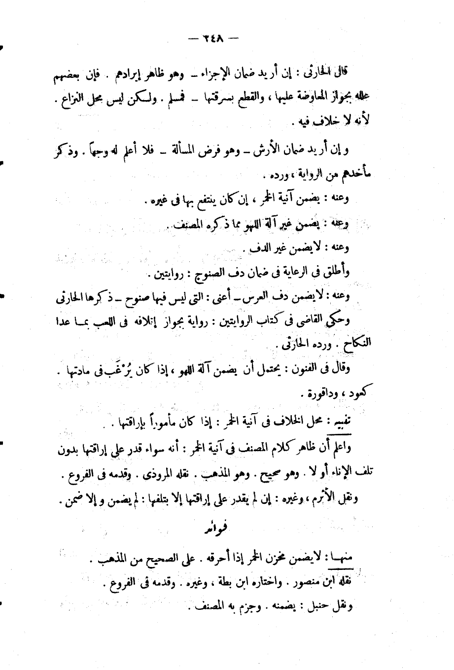 قَالَ الْحَارِثِيُّ: إنْ أُرِيدَ ضَمَانُ الْأَجْزَاءِ وَهُوَ ظَاهِرُ إيرَادِهِمْ. فَإِنَّ بَعْضَهُمْ عَلَّلَهُ بِجَوَازِ الْمُعَاوَضَةِ عَلَيْهَا، وَالْقَطْعُ بِسَرِقَتِهَا فَمُسَلَّمٌ. وَلَكِنْ لَيْسَ مَحَلُّ النِّزَاعِ لِأَنَّهُ لَا خِلَافَ فِيهِ. وَإِنْ أُرِيدَ ضَمَانُ الْأَرْشِ وَهُوَ فَرْضُ الْمَسْأَلَةِ فَلَا أَعْلَمُ لَهُ وَجْهًا. وَذَكَرَ مَأْخَذَهُمْ مِنْ الرِّوَايَةِ، وَرَدَّهُ. وَعَنْهُ: يَضْمَنُ آنِيَةَ الْخَمْرِ، إنْ كَانَ يُنْتَفَعُ بِهَا فِي غَيْرِهِ. وَعَنْهُ: يَضْمَنُ غَيْرَ آلَةِ اللَّهْوِ مِمَّا ذَكَرَهُ الْمُصَنِّفُ. وَعَنْهُ: لَا يَضْمَنُ غَيْرَ الدُّفِّ. وَأَطْلَقَ فِي الرِّعَايَةِ فِي ضَمَانِ دُفِّ الصُّنُوجِ: رِوَايَتَيْنِ. وَعَنْهُ: لَا يَضْمَنُ دُفَّ الْعُرْسِ أَعْنِي: الَّتِي لَيْسَ فِيهَا صُنُوجٌ ذَكَرَهَا الْحَارِثِيُّ وَحَكَى الْقَاضِي فِي كِتَابِ الرِّوَايَتَيْنِ: رِوَايَةً بِجَوَازِ إتْلَافِهِ فِي اللَّعِبِ بِمَا عَدَا النِّكَاحِ. وَرَدَّهُ الْحَارِثِيُّ. وَقَالَ فِي الْفُنُونِ: يَحْتَمِلُ أَنْ يَضْمَنَ آلَةَ اللَّهْوِ، إذَا كَانَ يُرْغَبُ فِي مَادَّتِهَا. كَعُودٍ، وَدَاقُورَةٍ.