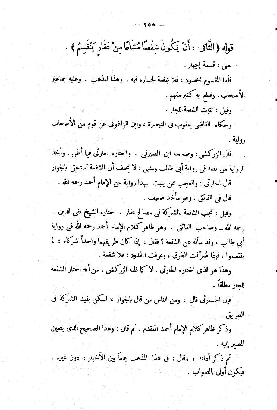 قَوْلُهُ (الثَّانِي: أَنْ يَكُونَ شِقْصًا مُشَاعًا مِنْ عَقَارٍ يَنْقَسِمُ) . يَعْنِي: قِسْمَةَ إجْبَارٍ. فَأَمَّا الْمَقْسُومُ الْمَحْدُودُ: فَلَا شُفْعَةَ لِجَارِهِ فِيهِ. وَهَذَا الْمَذْهَبُ. وَعَلَيْهِ جَمَاهِيرُ الْأَصْحَابِ. وَقَطَعَ بِهِ كَثِيرٌ مِنْهُمْ. وَقِيلَ: تَثْبُتُ الشُّفْعَةُ لِلْجَارِ. وَحَكَاهُ الْقَاضِي يَعْقُوبُ فِي التَّبْصِرَةِ، وَابْنُ الزَّاغُونِيِّ عَنْ قَوْمٍ مِنْ الْأَصْحَابِ رِوَايَةً. قَالَ الزَّرْكَشِيُّ: وَصَحَّحَهُ ابْنُ الصَّيْرَفِيِّ. وَاخْتَارَهُ الْحَارِثِيُّ فِيمَا أَظُنُّ. وَأَخَذَ الرِّوَايَةَ مِنْ نَصِّهِ فِي رِوَايَةِ أَبِي طَالِبٍ وَمُثَنًّى: لَا يَحْلِفُ أَنَّ الشُّفْعَةَ تُسْتَحَقُّ بِالْجِوَارِ قَالَ الْحَارِثِيُّ: وَالْعَجَبُ مِمَّنْ يَثْبُتُ بِهَذَا رِوَايَةً عَنْ الْإِمَامِ أَحْمَدَ - رَحِمَهُ اللَّهُ -. قَالَ فِي الْفَائِقِ: وَهُوَ مَأْخَذٌ ضَعِيفٌ. وَقِيلَ: تَجِبُ الشُّفْعَةُ بِالشَّرِكَةِ فِي مَصَالِحِ عَقَارٍ. اخْتَارَهُ الشَّيْخُ تَقِيُّ الدِّينِ - رَحِمَهُ اللَّهُ - وَصَاحِبُ الْفَائِقِ. وَهُوَ ظَاهِرُ كَلَامِ الْإِمَامِ أَحْمَدَ - رَحِمَهُ اللَّهُ - فِي رِوَايَةِ أَبِي طَالِبٍ، وَقَدْ سَأَلَهُ عَنْ الشُّفْعَةِ؟ فَقَالَ: إذَا كَانَ طَرِيقُهُمَا وَاحِدًا شُرَكَاءَ: لَمْ يَقْتَسِمُوا. فَإِذَا صُرِفَتْ الطُّرُقُ، وَعُرِفَتْ الْحُدُودُ: فَلَا شُفْعَةَ. وَهَذَا هُوَ الَّذِي اخْتَارَهُ الْحَارِثِيُّ. لَا كَمَا ظَنَّهُ الزَّرْكَشِيُّ، مِنْ أَنَّهُ اخْتَارَ الشُّفْعَةَ لِلْجَارِ مُطْلَقًا. فَإِنَّ الْحَارِثِيَّ قَالَ: وَمِنْ النَّاسِ مَنْ قَالَ بِالْجَوَازِ، لَكِنْ بِقَيْدِ الشَّرِكَةِ فِي الطَّرِيقِ. وَذَكَرَ ظَاهِرَ كَلَامِ الْإِمَامِ أَحْمَدَ الْمُتَقَدِّمِ. ثُمَّ قَالَ: وَهَذَا الصَّحِيحُ الَّذِي يَتَعَيَّنُ الْمَصِيرُ إلَيْهِ. ثُمَّ ذَكَرَ أَدِلَّتَهُ، وَقَالَ: فِي هَذَا الْمَذْهَبُ جَمْعٌ بَيْنَ الْأَخْبَارِ، دُونَ غَيْرِهِ. فَيَكُونُ أَوْلَى بِالصَّوَابِ.