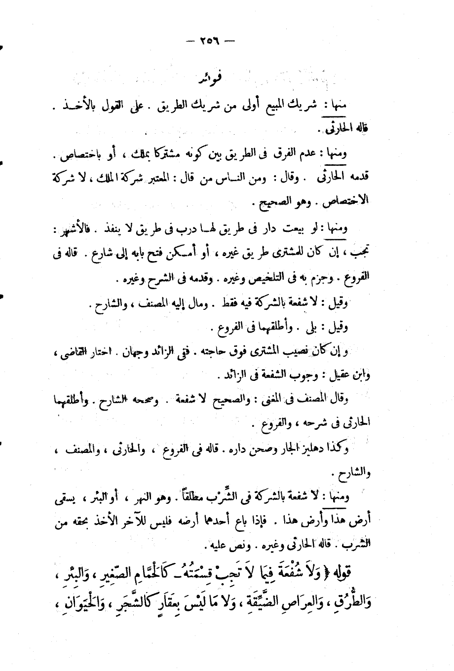 وَمِنْهَا: عَدَمُ الْفَرْقِ فِي الطَّرِيقِ بَيْنَ كَوْنِهِ مُشْتَرَكًا بِمِلْكٍ، أَوْ بِاخْتِصَاصٍ. قَدَّمَهُ الْحَارِثِيُّ. وَقَالَ: وَمِنْ النَّاسِ مَنْ قَالَ: الْمُعْتَبَرُ شَرِكَةُ الْمِلْكِ، لَا شَرِكَةُ الِاخْتِصَاصِ. وَهُوَ الصَّحِيحُ.
