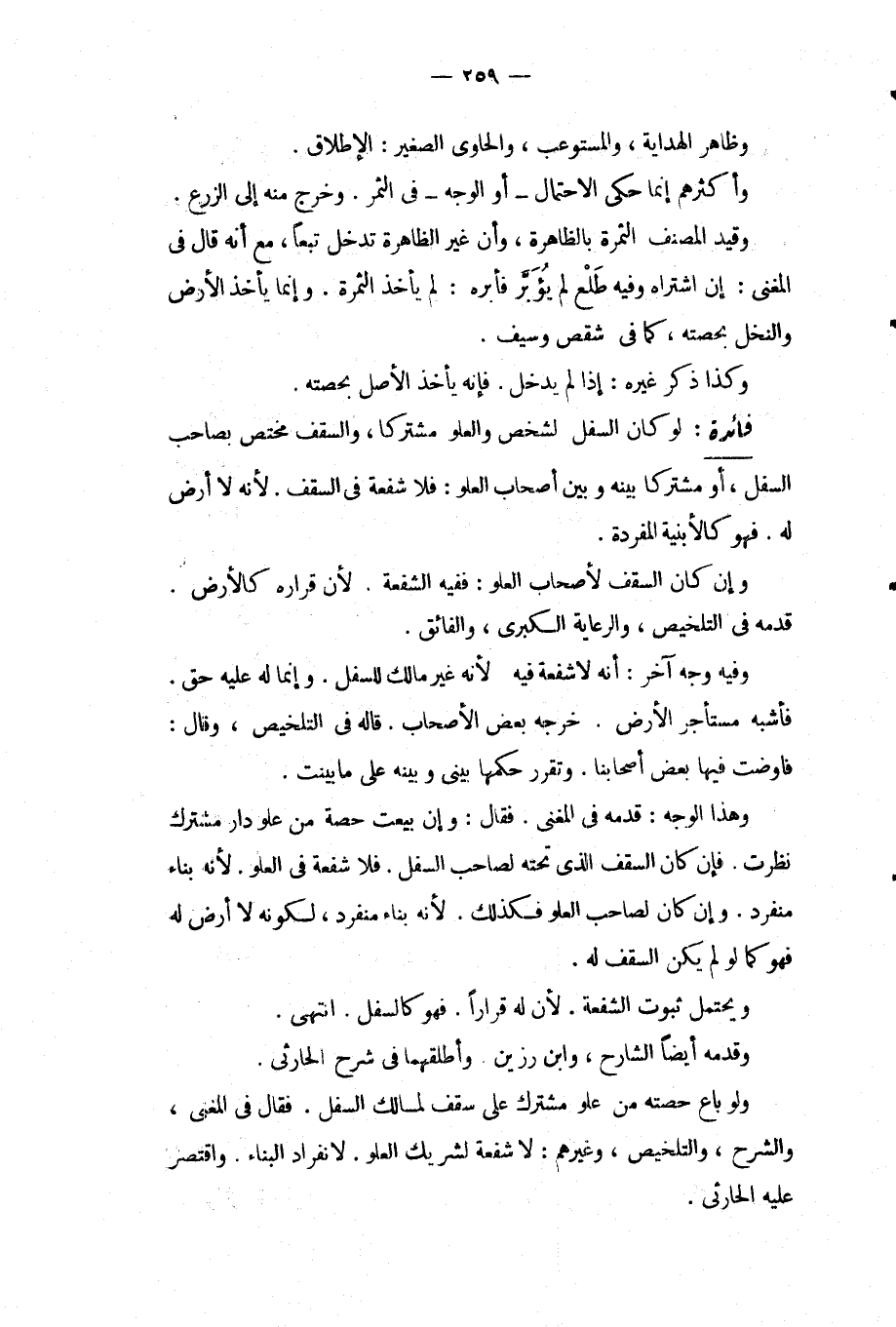 فَائِدَةٌ: لَوْ كَانَ السُّفْلُ لِشَخْصٍ وَالْعُلْوُ مُشْتَرَكًا، وَالسَّقْفُ مُخْتَصًّا بِصَاحِبِ السُّفْلِ، أَوْ مُشْتَرَكًا بَيْنَهُ وَبَيْنَ أَصْحَابِ الْعُلْوِ: فَلَا شُفْعَةَ فِي السَّقْفِ. لِأَنَّهُ لَا أَرْضَ لَهُ. فَهُوَ كَالْأَبْنِيَةِ الْمُفْرَدَةِ. وَإِنْ كَانَ السَّقْفُ لِأَصْحَابِ الْعُلْوِ: فَفِيهِ الشُّفْعَةُ. لِأَنَّ قَرَارَهُ كَالْأَرْضِ قَدَّمَهُ فِي التَّلْخِيصِ، وَالرِّعَايَةِ الْكُبْرَى، وَالْفَائِقِ. وَفِيهِ وَجْهٌ آخَرُ: أَنَّهُ لَا شُفْعَةَ فِيهِ لِأَنَّهُ غَيْرُ مَالِكٍ لِلسُّفْلِ. وَإِنَّمَا لَهُ عَلَيْهِ حَقٌّ. فَأَشْبَهَ مُسْتَأْجِرَ الْأَرْضِ. خَرَّجَهُ بَعْضُ الْأَصْحَابِ. قَالَهُ فِي التَّلْخِيصِ، وَقَالَ: فَاوَضْت فِيهَا بَعْضَ أَصْحَابِنَا. وَتَقَرَّرَ حُكْمُهَا بَيْنِي وَبَيْنَهُ عَلَى مَا بَيَّنْت. وَهَذَا الْوَجْهُ: قَدَّمَهُ فِي الْمُغْنِي. فَقَالَ: وَإِنْ بِيعَتْ حِصَّةٌ مِنْ عُلْوِ دَارٍ مُشْتَرَكٍ نُظِرَتْ. فَإِنْ كَانَ السَّقْفُ الَّذِي تَحْتَهُ لِصَاحِبِ السُّفْلِ. فَلَا شُفْعَةَ فِي الْعُلْوِ. لِأَنَّهُ بِنَاءٌ مُنْفَرِدٌ. وَإِنْ كَانَ لِصَاحِبِ الْعُلْوِ كَذَلِكَ. لِأَنَّهُ بِنَاءٌ مُنْفَرِدٌ، لِكَوْنِهِ لَا أَرْضَ لَهُ فَهُوَ كَمَا لَوْ لَمْ يَكُنْ السَّقْفُ لَهُ. وَيَحْتَمِلُ ثُبُوتَ الشُّفْعَةِ. لِأَنَّ لَهُ قَرَارًا. فَهُوَ كَالسُّفْلِ. انْتَهَى. وَقَدَّمَهُ أَيْضًا الشَّارِحُ، وَابْنُ رَزِينٍ. وَأَطْلَقَهُمَا فِي شَرْحِ الْحَارِثِيِّ. وَلَوْ بَاعَ حِصَّتَهُ مِنْ عُلْوٍ مُشْتَرَكٍ عَلَى سَقْفٍ لِمَالِكِ السُّفْلِ. فَقَالَ فِي الْمُغْنِي، وَالشَّرْحِ، وَالتَّلْخِيصِ، وَغَيْرِهِمْ: لَا شُفْعَةَ لِشَرِيكِ الْعُلْوِ. لِانْفِرَادِ الْبِنَاءِ. وَاقْتَصَرَ عَلَيْهِ الْحَارِثِيُّ.