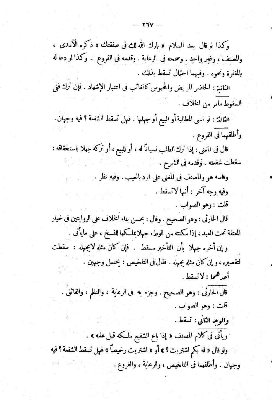 وَالْوَجْهُ الثَّانِي: تَسْقُطُ. وَيَأْتِي فِي كَلَامِ الْمُصَنِّفِ " إذَا بَاعَ الشَّفِيعُ مِلْكَهُ قَبْلَ عِلْمِهِ ". وَلَوْ قَالَ " لَهُ بِكَمْ اشْتَرَيْت؟ " أَوْ " اشْتَرَيْت رَخِيصًا " فَهَلْ تَسْقُطُ الشُّفْعَةُ؟ فِيهِ وَجْهَانِ. وَأَطْلَقَهُمَا فِي التَّلْخِيصِ، وَالرِّعَايَةِ، وَالْفُرُوعِ.