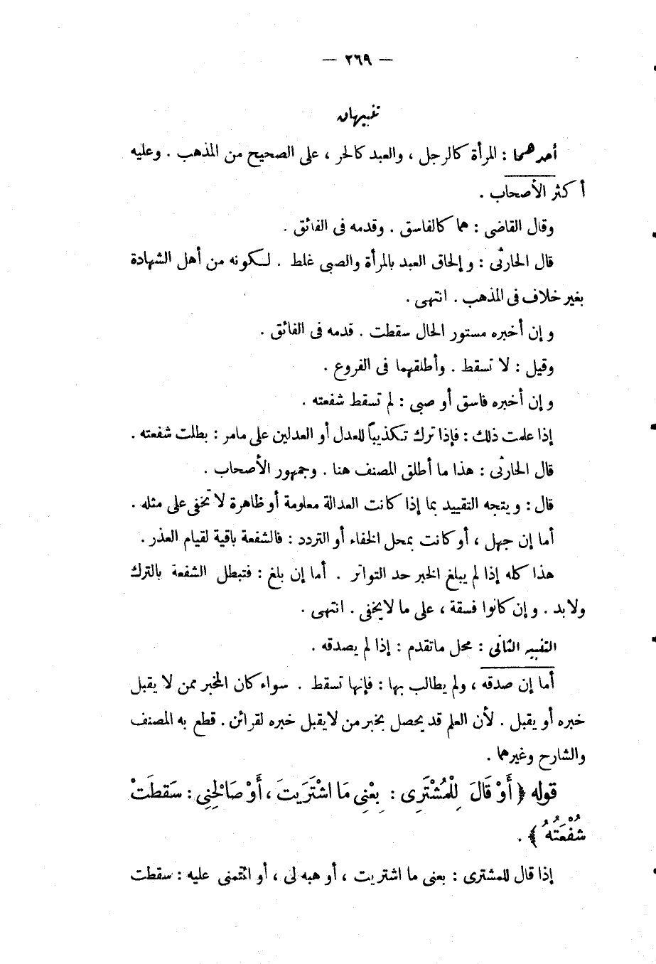 تَنْبِيهَانِ: أَحَدُهُمَا: الْمَرْأَةُ كَالرَّجُلِ، وَالْعَبْدُ كَالْحُرِّ، عَلَى الصَّحِيحِ مِنْ الْمَذْهَبِ. وَعَلَيْهِ أَكْثَرُ الْأَصْحَابِ. وَقَالَ الْقَاضِي: هُمَا كَالْفَاسِقِ. وَقَدَّمَهُ فِي الْفَائِقِ. قَالَ الْحَارِثِيُّ: وَإِلْحَاقُ الْعَبْدِ بِالْمَرْأَةِ وَالصَّبِيِّ غَلَطٌ. لِكَوْنِهِ مِنْ أَهْلِ الشَّهَادَةِ بِغَيْرِ خِلَافٍ فِي الْمَذْهَبِ. انْتَهَى. وَإِنْ أَخْبَرَ مَسْتُورُ الْحَالِ سَقَطَتْ. قَدَّمَهُ فِي الْفَائِقِ. وَقِيلَ: لَا تَسْقُطُ. وَأَطْلَقَهُمَا فِي الْفُرُوعِ. وَإِنْ أَخْبَرَهُ فَاسِقٌ أَوْ صَبِيٌّ: لَمْ تَسْقُطْ شُفْعَتُهُ. إذَا عَلِمْت ذَلِكَ: فَإِذَا تَرَكَ تَكْذِيبًا لِلْعَدْلِ أَوْ الْعَدْلَيْنِ عَلَى مَا مَرَّ: بَطَلَتْ شُفْعَتُهُ. قَالَ الْحَارِثِيُّ: هَذَا مَا أَطْلَقَ الْمُصَنِّفُ هُنَا. وَجُمْهُورُ الْأَصْحَابِ. قَالَ: وَيَتَّجِهُ التَّقْيِيدُ بِمَا إذَا كَانَتْ الْعَدَالَةُ مَعْلُومَةً أَوْ ظَاهِرَةً لَا تَخْفَى عَلَى مِثْلِهِ. أَمَّا إنْ جَهِلَ، أَوْ كَانَتْ بِمَحَلِّ الْخَفَاءِ أَوْ التَّرَدُّدِ: فَالشُّفْعَةُ بَاقِيَةٌ لِقِيَامِ الْعُذْرِ. هَذَا كُلُّهُ إذَا لَمْ يَبْلُغْ الْخَبَرُ حَدَّ التَّوَاتُرِ. أَمَّا إنْ بَلَغَ: فَتَبْطُلُ الشُّفْعَةُ بِالتَّرْكِ وَلَا بُدَّ. وَإِنْ كَانُوا فَسَقَةً، عَلَى مَا لَا يَخْفَى. انْتَهَى.