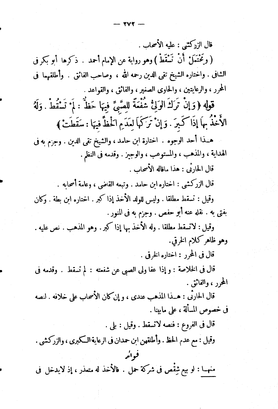 فَوَائِدُ: مِنْهَا: لَوْ بِيعَ شِقْصٌ فِي شِرْكَةِ حَمْلٍ. فَالْأَخْذُ لَهُ مُتَعَذِّرٌ، إذْ لَا يَدْخُلُ فِي