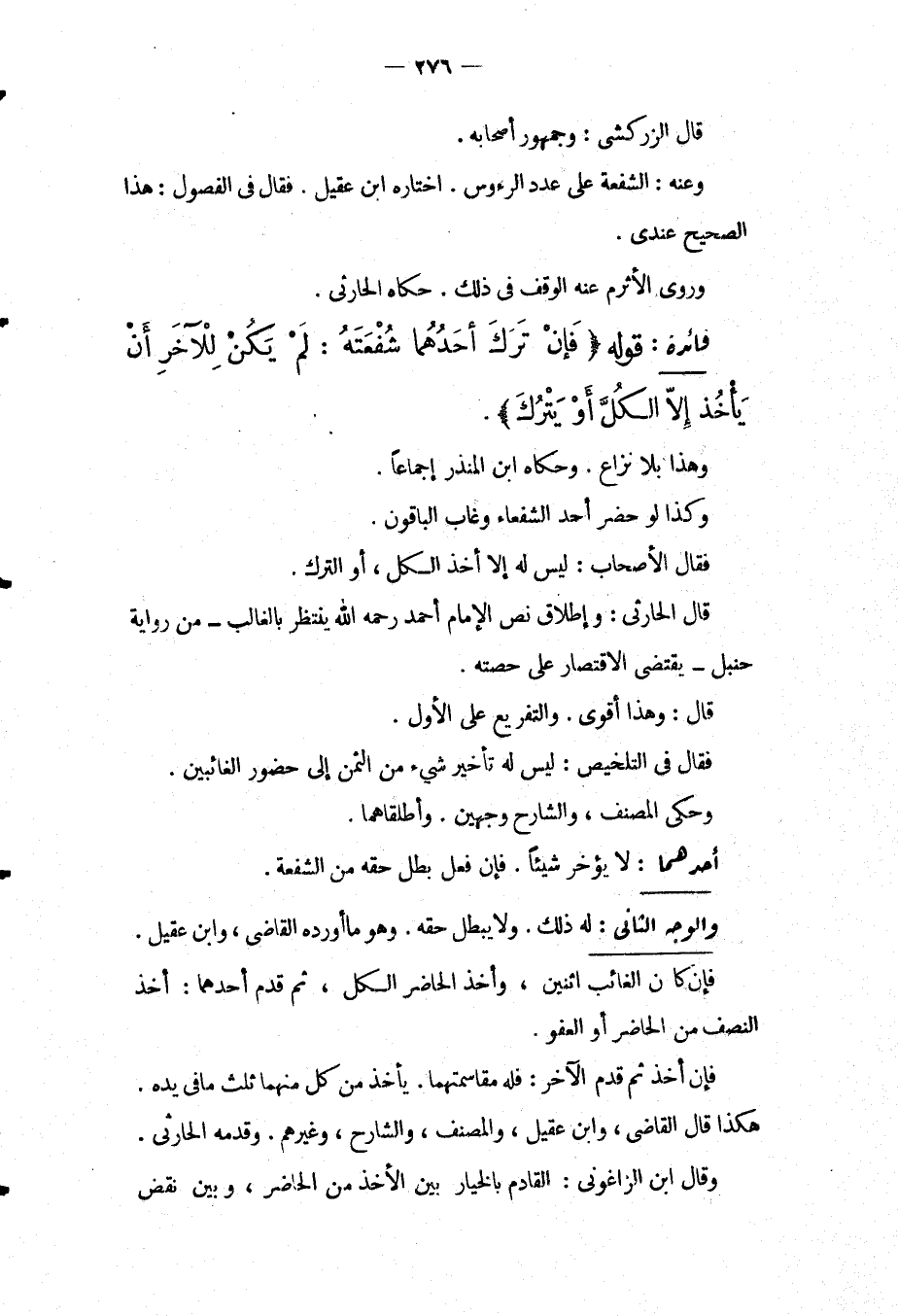قَالَ الزَّرْكَشِيُّ: وَجُمْهُورُ أَصْحَابِهِ. وَعَنْهُ: الشُّفْعَةُ عَلَى عَدَدِ الرُّءُوسِ. اخْتَارَهُ ابْنُ عَقِيلٍ. فَقَالَ فِي الْفُصُولِ: هَذَا الصَّحِيحُ عِنْدِي. وَرَوَى الْأَثْرَمُ عَنْهُ الْوَقْفَ فِي ذَلِكَ. حَكَاهُ الْحَارِثِيُّ.