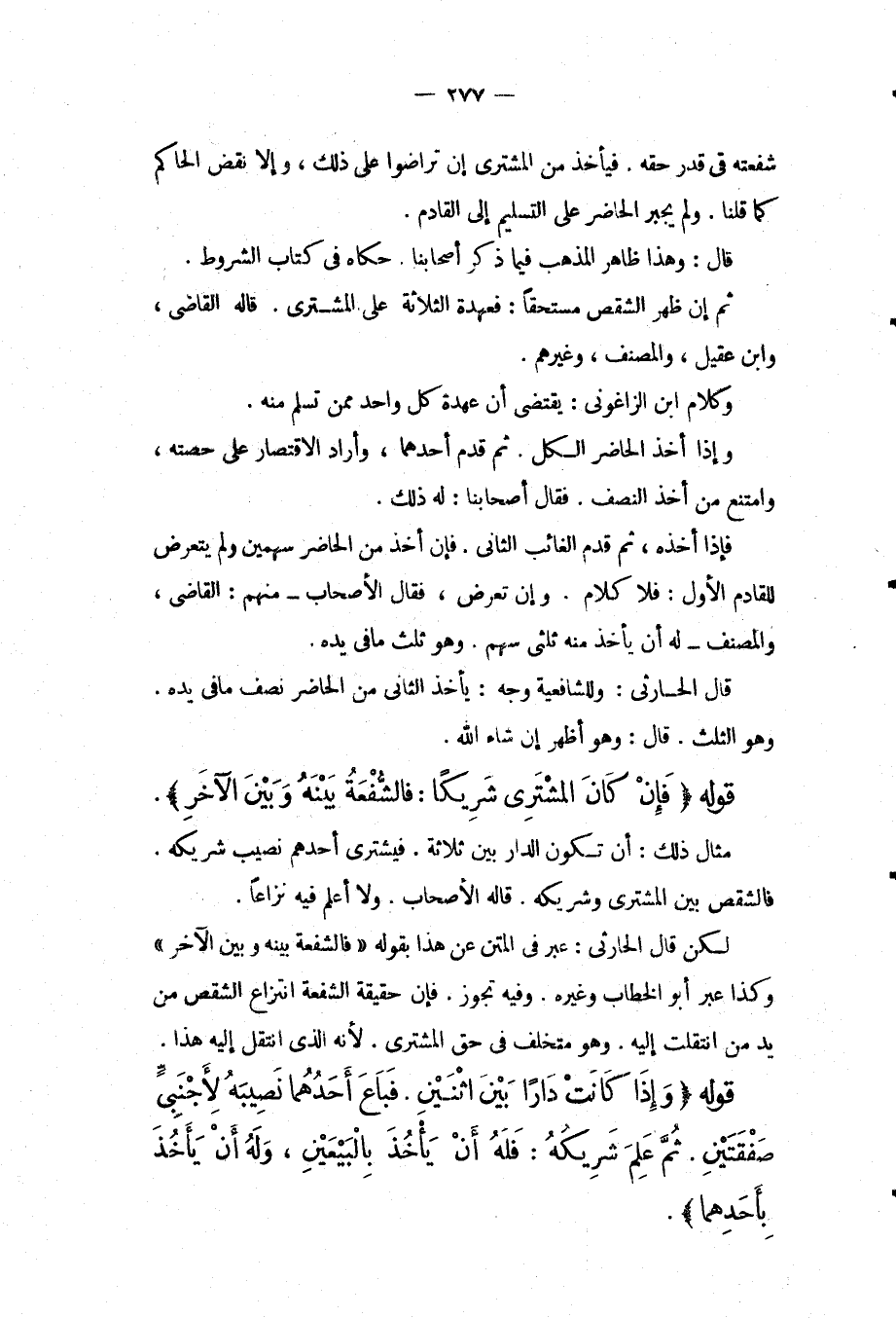 شُفْعَتِهِ فِي قَدْرِ حَقِّهِ. فَيَأْخُذُ مِنْ الْمُشْتَرِي إنْ تَرَاضَوْا عَلَى ذَلِكَ، وَإِلَّا نَقَضَ الْحَاكِمُ كَمَا قُلْنَا. وَلَمْ يُجْبَرْ الْحَاضِرُ عَلَى التَّسْلِيمِ إلَى الْقَادِمِ. قَالَ: وَهَذَا ظَاهِرُ الْمَذْهَبِ فِيمَا ذَكَرَ أَصْحَابُنَا. حَكَاهُ فِي كِتَابِ الشُّرُوطِ. ثُمَّ إنْ ظَهَرَ الشِّقْصُ مُسْتَحَقًّا: فَهَذِهِ الثَّلَاثَةُ عَلَى الْمُشْتَرِي. قَالَهُ الْقَاضِي، وَابْنُ عَقِيلٍ، وَالْمُصَنِّفُ، وَغَيْرُهُمْ. وَكَلَامُ ابْنِ الزَّاغُونِيِّ: يَقْتَضِي أَنَّ عُهْدَةَ كُلِّ وَاحِدٍ مِمَّنْ تَسَلَّمَ مِنْهُ. وَإِذَا أَخَذَ الْحَاضِرُ الْكُلَّ. ثُمَّ قَدِمَ أَحَدُهُمَا، وَأَرَادَ الِاقْتِصَارَ عَلَى حِصَّتِهِ، وَامْتَنَعَ مِنْ أَخْذِ النِّصْفِ. فَقَالَ أَصْحَابُنَا: لَهُ ذَلِكَ. فَإِذَا أَخَذَهُ، ثُمَّ قَدِمَ الْغَائِبُ الثَّانِي. فَإِنْ أَخَذَ مِنْ الْحَاضِرِ سَهْمَيْنِ وَلَمْ يَتَعَرَّضْ لِلْقَادِمِ الْأَوَّلِ: فَلَا كَلَامَ. وَإِنْ تَعَرَّضَ، فَقَالَ الْأَصْحَابُ مِنْهُمْ: الْقَاضِي، وَالْمُصَنِّفُ لَهُ أَنْ يَأْخُذَ مِنْهُ ثُلُثَيْ سَهْمٍ. وَهُوَ ثُلُثُ مَا فِي يَدِهِ. قَالَ الْحَارِثِيُّ: وَلِلشَّافِعِيَّةِ وَجْهٌ: يَأْخُذُ الثَّانِي مِنْ الْحَاضِرِ نِصْفَ مَا فِي يَدِهِ. وَهُوَ الثُّلُثُ. قَالَ: وَهُوَ أَظْهَرُ إنْ شَاءَ اللَّهُ.