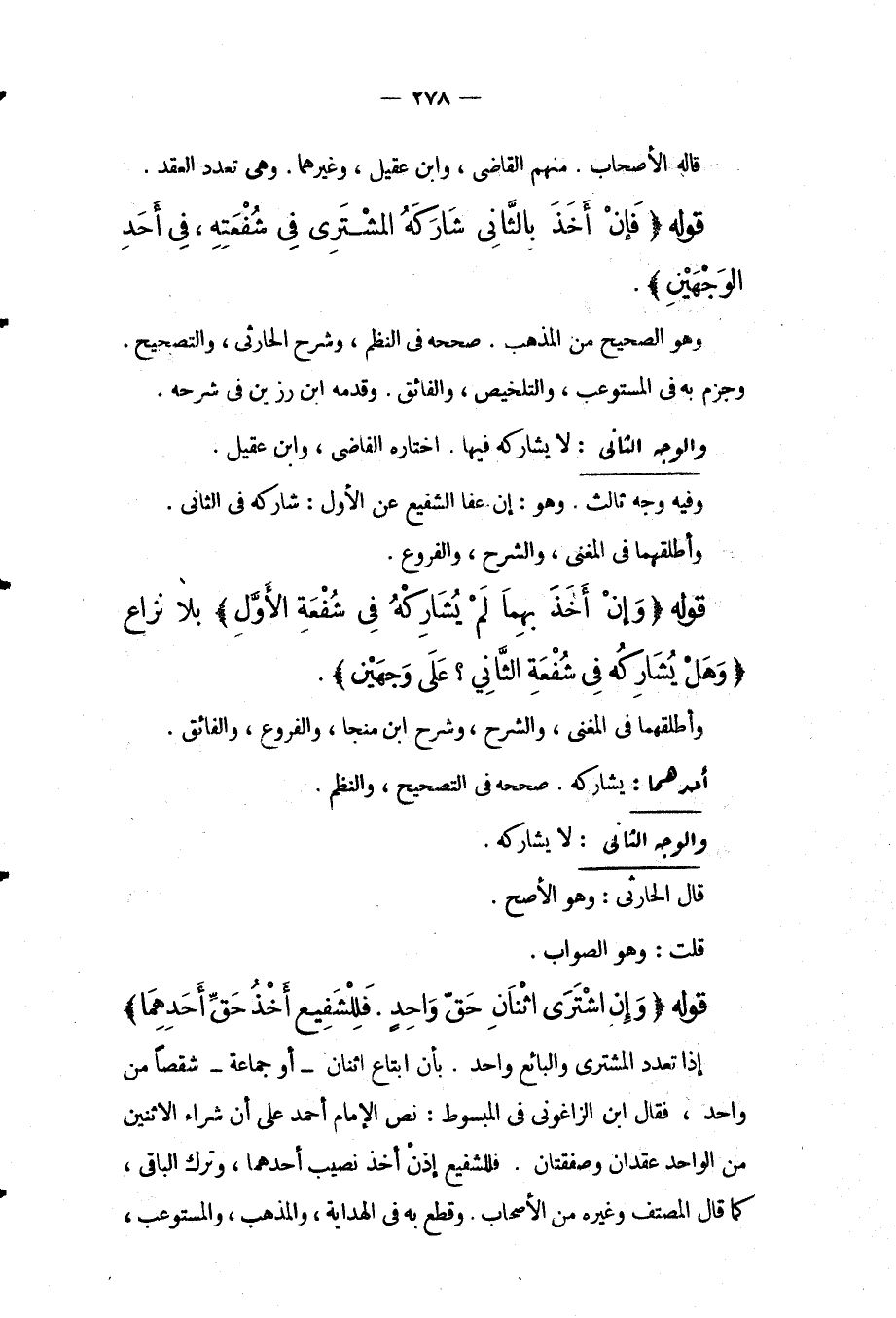 وَالْوَجْهُ الثَّانِي: لَا يُشَارِكُهُ فِيهَا. اخْتَارَهُ الْقَاضِي، وَابْنُ عَقِيلٍ. وَفِيهِ وَجْهٌ ثَالِثٌ. وَهُوَ: إنْ عَفَا الشَّفِيعُ عَنْ الْأَوَّلِ: شَارَكَهُ فِي الثَّانِي. وَأَطْلَقَهُمَا فِي الْمُغْنِي، وَالشَّرْحِ، وَالْفُرُوعِ. قَوْلُهُ (وَإِنْ أَخَذَ بِهِمَا لَمْ يُشَارِكْهُ فِي شُفْعَةِ الْأَوَّلِ) بِلَا نِزَاعٍ (وَهَلْ يُشَارِكُهُ فِي شُفْعَةِ الثَّانِي؟ عَلَى وَجْهَيْنِ) . وَأَطْلَقَهُمَا فِي الْمُغْنِي، وَالشَّرْحِ، وَشَرْحِ ابْنِ مُنَجَّا، وَالْفُرُوعِ، وَالْفَائِقِ.