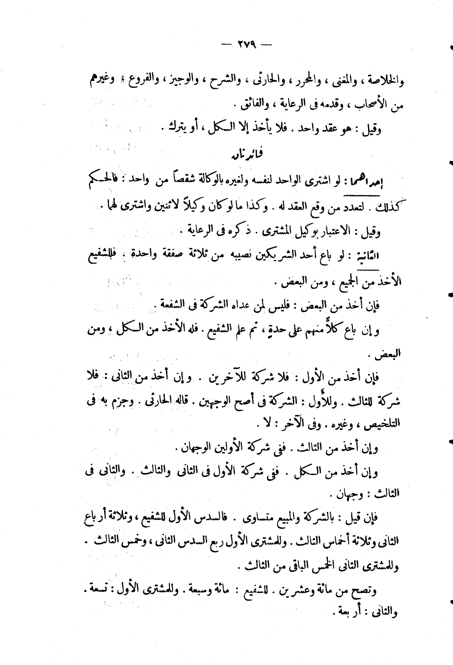 فَائِدَتَانِ: إحْدَاهُمَا: لَوْ اشْتَرَى الْوَاحِدُ لِنَفْسِهِ وَلِغَيْرِهِ بِالْوِكَالَةِ شِقْصًا مِنْ وَاحِدٍ: فَالْحُكْمُ كَذَلِكَ. لِتَعَدُّدِ مَنْ وَقَعَ الْعَقْدُ لَهُ. وَكَذَا مَا لَوْ كَانَ وَكِيلًا لِاثْنَيْنِ وَاشْتَرَى لَهُمَا. وَقِيلَ: الِاعْتِبَارُ بِوَكِيلِ الْمُشْتَرِي. ذَكَرَهُ فِي الرِّعَايَةِ.