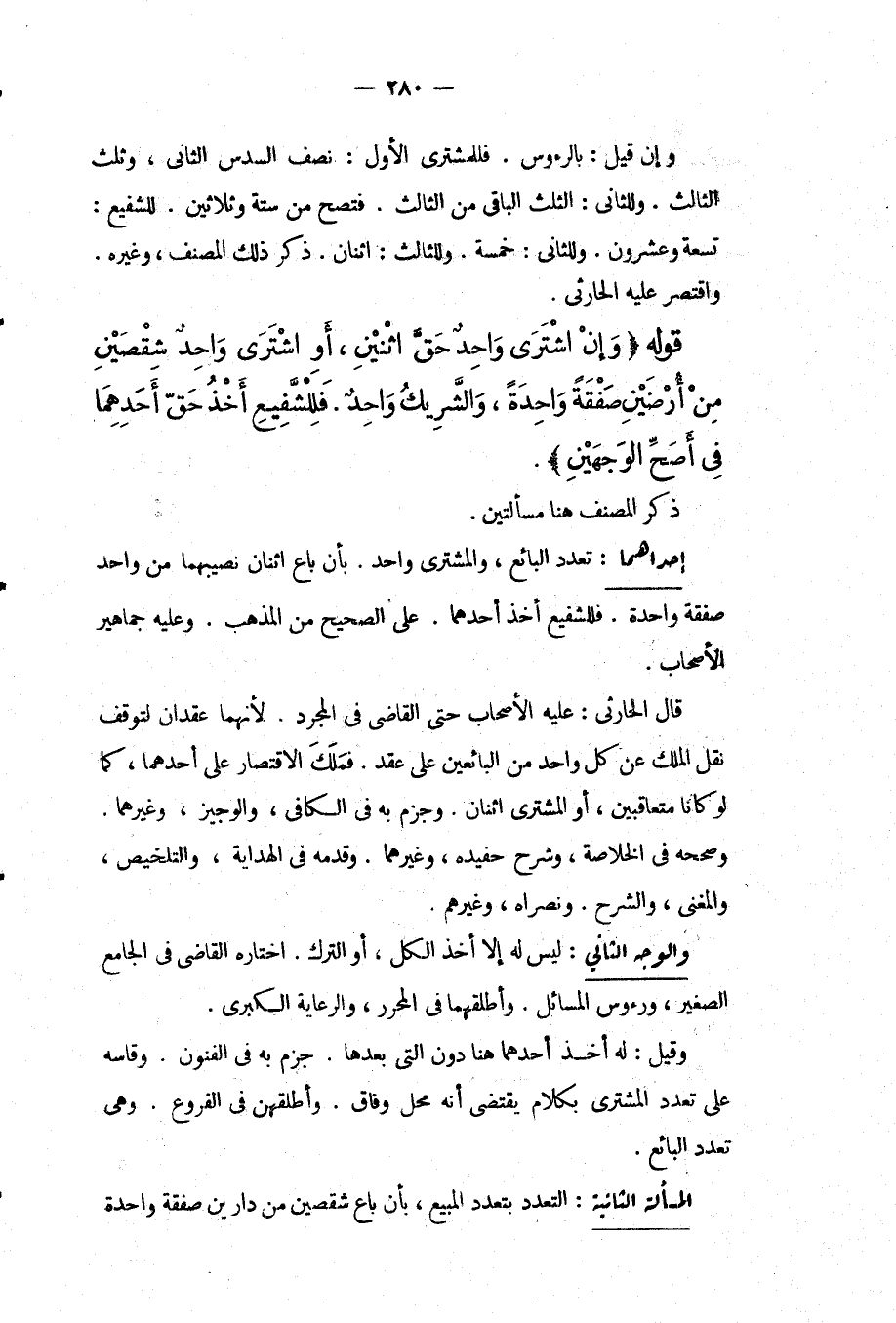 إحْدَاهُمَا: تَعَدُّدُ الْبَائِعِ، وَالْمُشْتَرِي وَاحِدٌ. بِأَنْ بَاعَ اثْنَانِ نَصِيبَهُمَا مِنْ وَاحِدٍ صَفْقَةً وَاحِدَةً. فَلِلشَّفِيعِ أَخْذُ أَحَدِهِمَا. عَلَى الصَّحِيحِ مِنْ الْمَذْهَبِ. وَعَلَيْهِ جَمَاهِيرُ الْأَصْحَابِ. قَالَ الْحَارِثِيُّ: عَلَيْهِ الْأَصْحَابُ حَتَّى الْقَاضِي فِي الْمُجَرَّدِ. لِأَنَّهُمَا عَقْدَانِ لِتَوَقُّفِ نَقْلِ الْمِلْكِ عَنْ كُلِّ وَاحِدٍ مِنْ الْبَائِعَيْنِ عَلَى عَقْدٍ. فَمَلَكَ الِاقْتِصَارَ عَلَى أَحَدِهِمَا كَمَا لَوْ كَانَا مُتَعَاقِبَيْنِ، أَوْ الْمُشْتَرِي اثْنَانِ. وَجَزَمَ بِهِ فِي الْكَافِي، وَالْوَجِيزِ، وَغَيْرِهِمَا. وَصَحَّحَهُ فِي الْخُلَاصَةِ، وَشَرْحِ حَفِيدِهِ، وَغَيْرِهِمَا. وَقَدَّمَهُ فِي الْهِدَايَةِ، وَالتَّلْخِيصِ، وَالْمُغْنِي، وَالشَّرْحِ. وَنَصَرَاهُ، وَغَيْرُهُمْ.